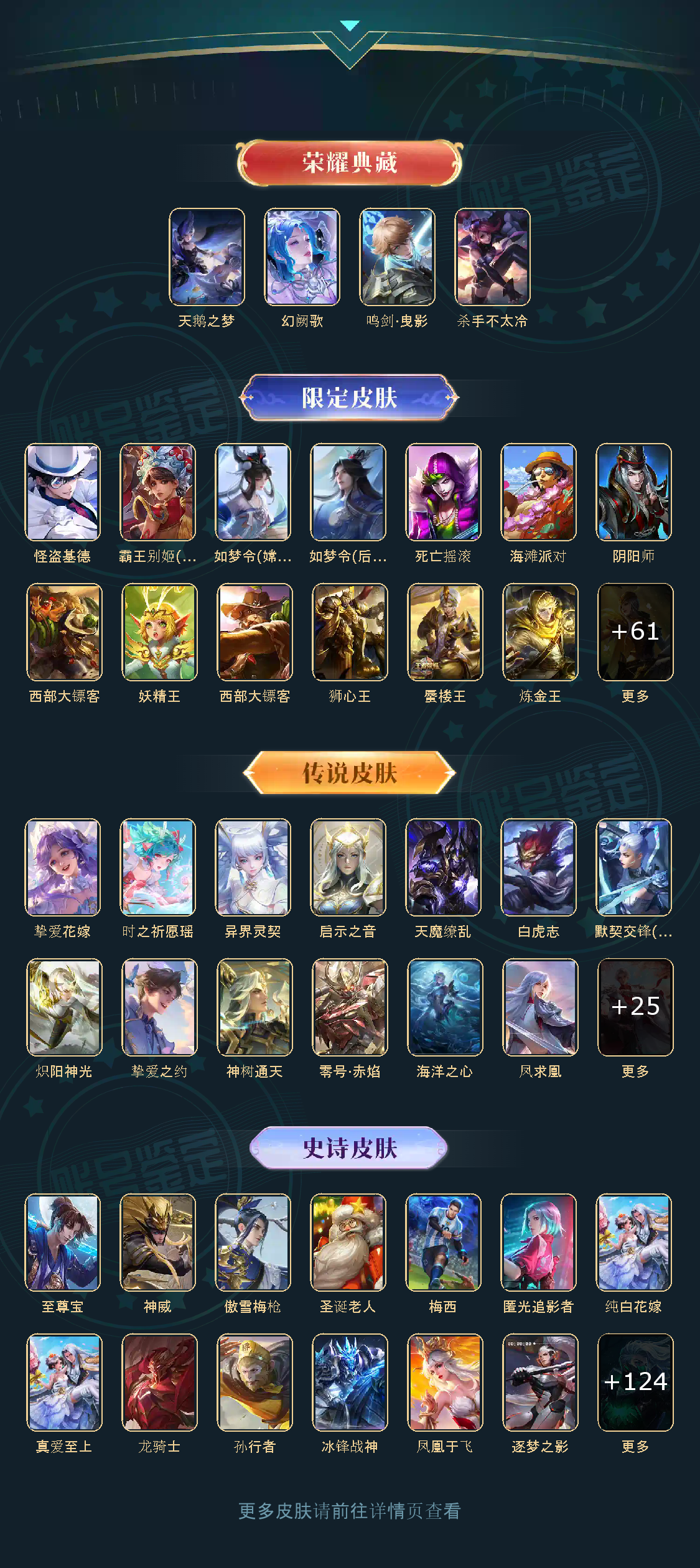 贵族等级V10,英雄数量124,典藏皮肤数4,皮肤数量425,天鹅之梦/杀手不太冷/鸣剑·曳影/启示之音
