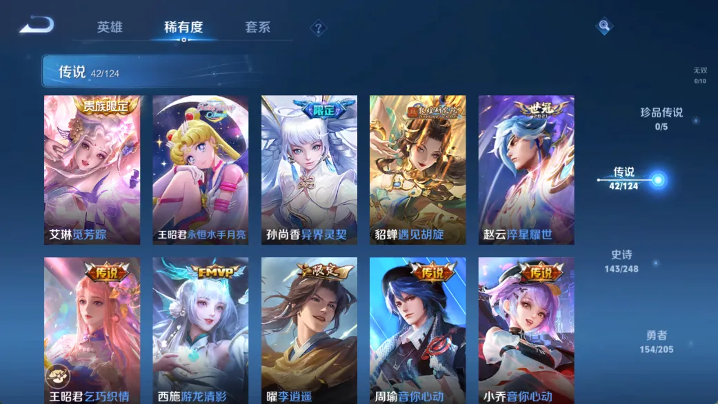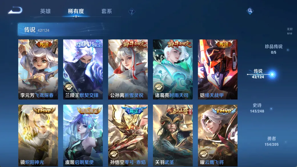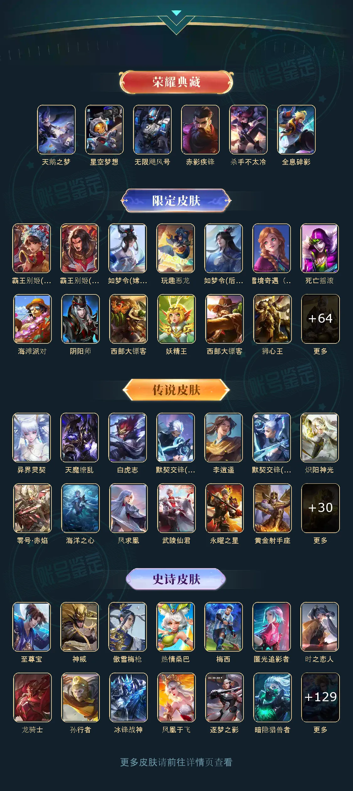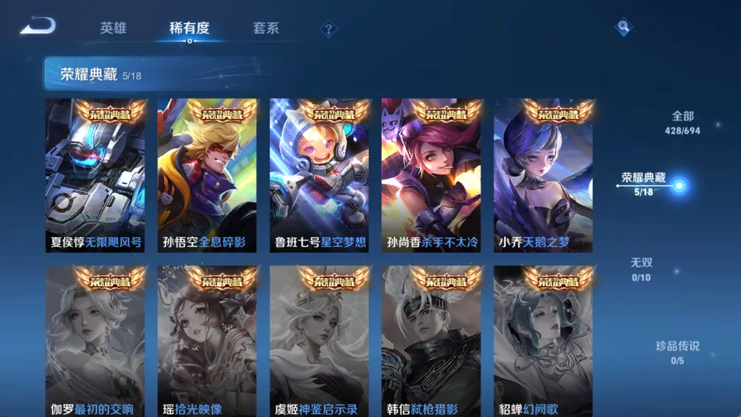 贵族等级V10,英雄数量122,典藏皮肤数5,皮肤数量428,天鹅之梦/杀手不太冷/星空梦想/无限飓风号/全息碎影/遇见胡旋/李逍遥