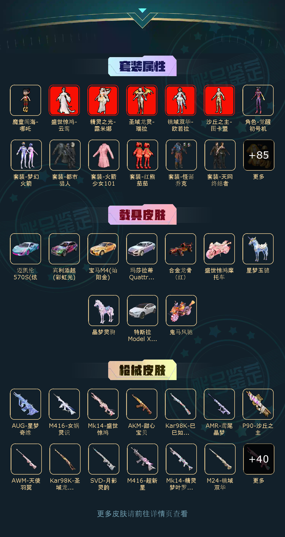 93粉,10载具,372套装,22王牌印记,无敌战神历史最高段,254589热力值 平底锅-仲夏莫吉托/平底锅-林间仙鹿/AKM-甜心宝贝/SCAR-L-童趣迷兔/AUG-星梦奇缘/SCAR-L-甜梦小狐/M762-甜心娃娃/GROZA-旋转彩虹/GROZA-香水柠檬/M416-暖熊萌萌/M416-心之恋语/M416-女娲灵识/M16A4-垂柳戏鸭/AKM-白勺歌姬/GROZA-精灵之光/GROZA-焦糖拿铁/SCAR-L-时空协奏/AUG-妙趣可丽/M416-超新星/AKM-梦之光华/SCAR-L-魔童闹海 哪吒/SPAS-12-蜜语绒猫/M417-第五大道/SKS-碧影闪光/Mk14-盛世惊鸿/Mk14-精灵梦叶罗丽/Mk14-樱桃泡泡/M249-彩虹甜喵/PKM-天星战神/MG3-洛神天依/DP-28-千金淑猫/M249-蓝莓炮弹/DP-28-豹影疾电/UZI-畅跳缤纷/P90-仙履奇缘/Vector-红伞翩翩/Vector-灵感创作师/UMP45-雪国精灵/UMP45-恐龙拽拽/P90-沙丘之主/汤姆逊-冰川粉黛/烟雾弹-丁香清露/烟雾弹-猫咪绅士/破片手榴弹-粉粉猫爪/Kar98K-圣域龙灵/AMR-鸢尾晶梦/Kar98K-巳巳如意/AWM-橘柚倾心/M24-镜域双华/AWM-天使羽翼/AMR-智耀战神/SVD-月影灵韵/M24-莲影清波/宝马M4(灿阳金)/玛莎拉蒂Quattroporte(幻星粉)/特斯拉Model X(珍珠白)/宾利添越(彩虹光)/鬼马风驰/合金龙骨(红)/迈凯伦570S(炫冰蓝)/星梦玉骢/晶梦灵驹/盛世惊鸿摩托车/