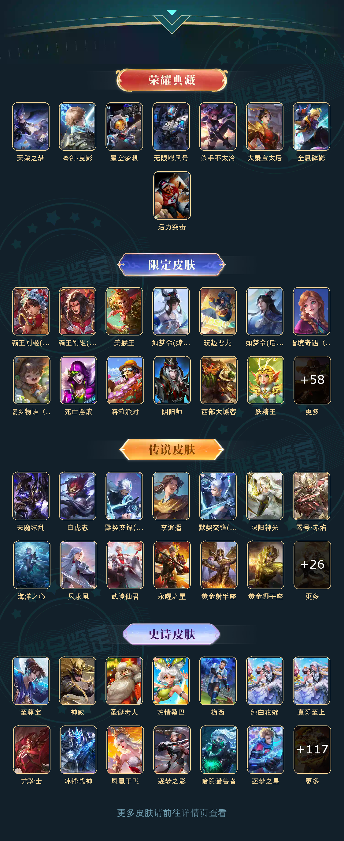 贵族等级V10,英雄数量123,典藏皮肤数8,皮肤数量412,杀手不太冷/大秦宣太后/星空梦想/无限飓风号/全息碎影/活力突击/鸣剑·曳影/李逍遥