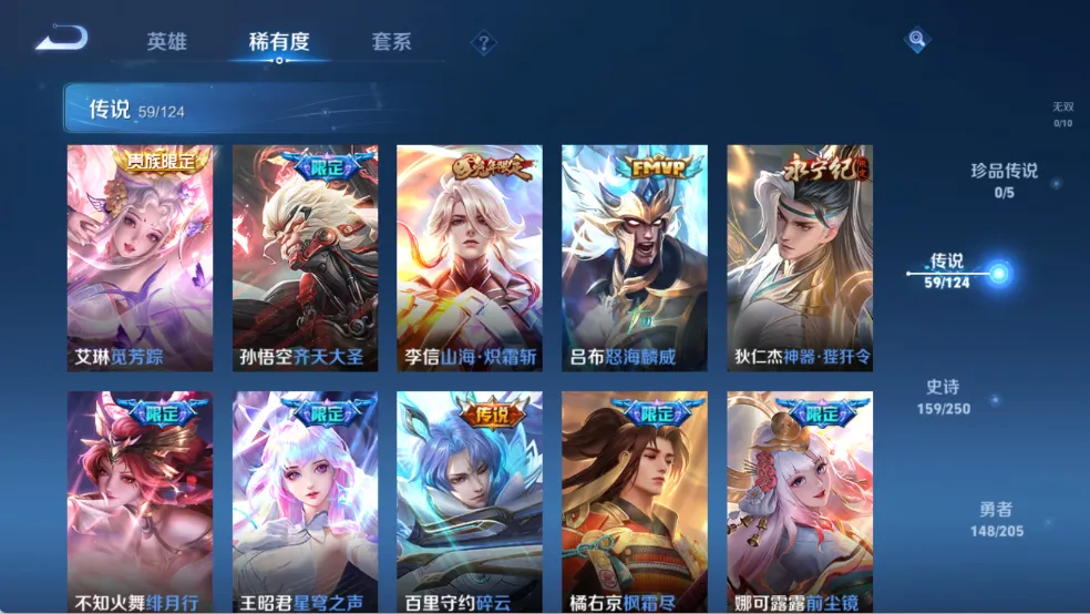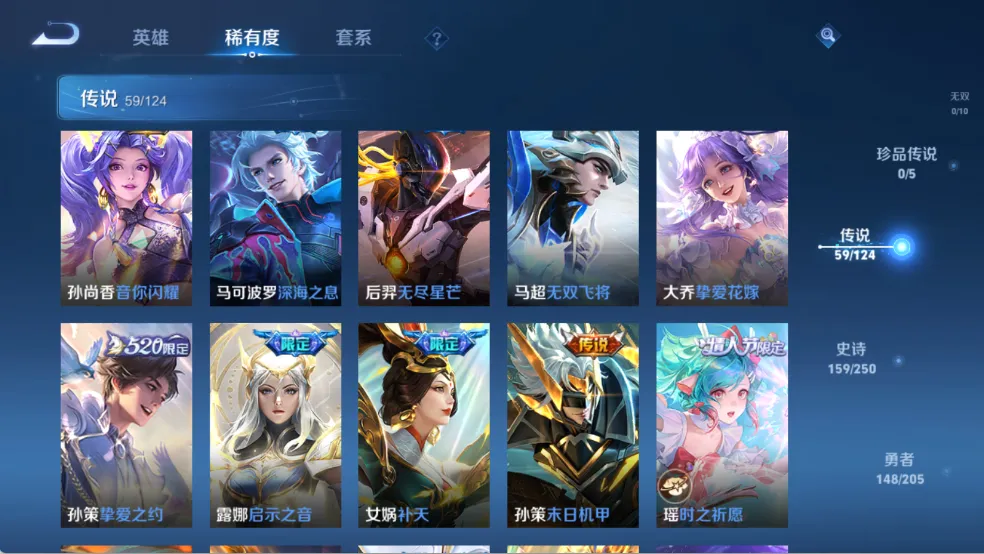 天鹅之梦,星空梦想,无限飓风号,鸣剑·曳影,赤影疾锋,星域神启,弑枪猎影,九霄神辉,银白咏叹调,天魔缭乱,白虎志,默契交锋(兰陵王),李逍遥,默契交锋(花木兰),零号·赤焰,炽阳神光,热情桑巴,神威,纯白花嫁,真爱至上,匿光追影者,无双飞将,时之祈愿瑶,挚爱之约,挚爱花嫁,深海之息,补天,异界灵契,启示之音,傲雪梅枪