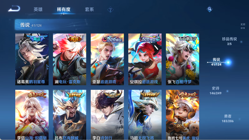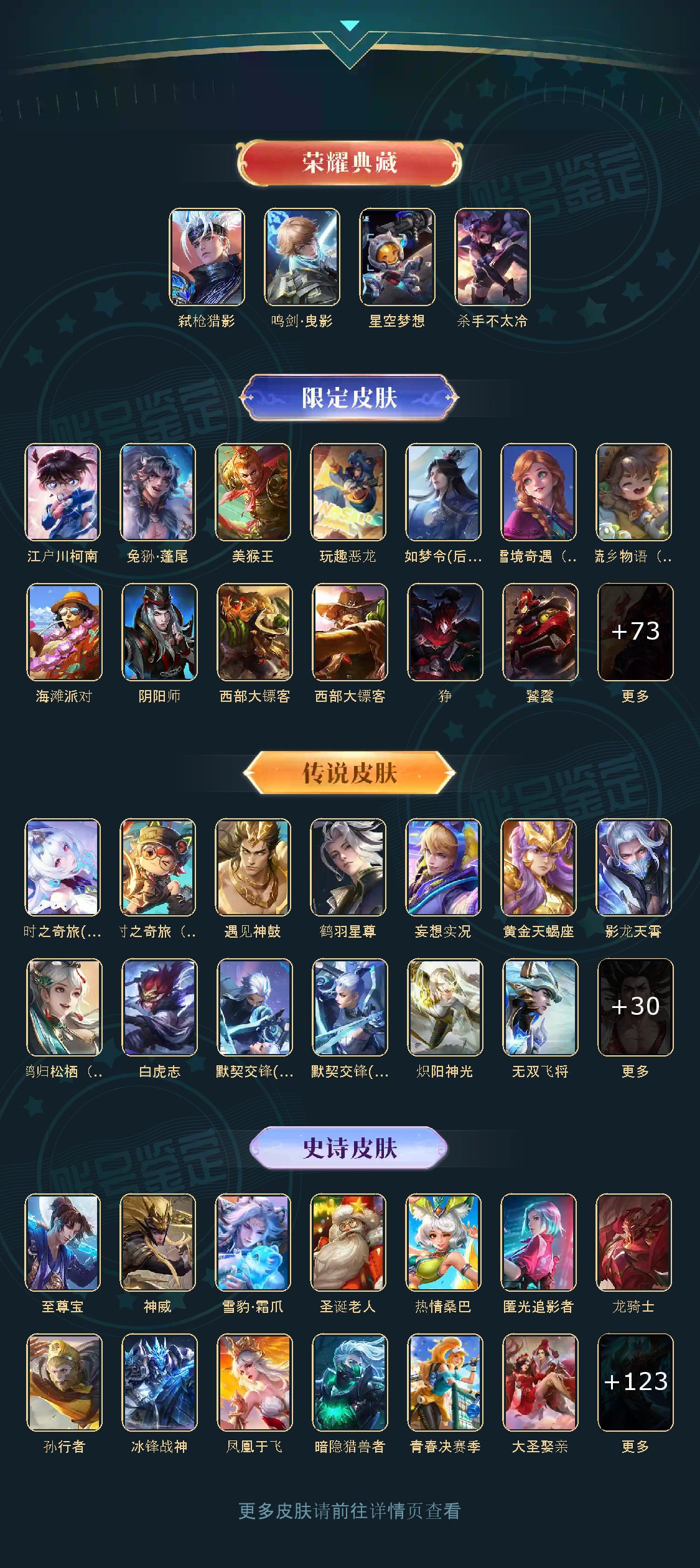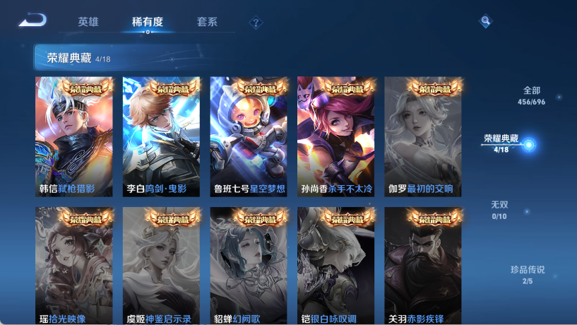 贵族等级V10,英雄数量125,典藏皮肤数4,皮肤数量456,