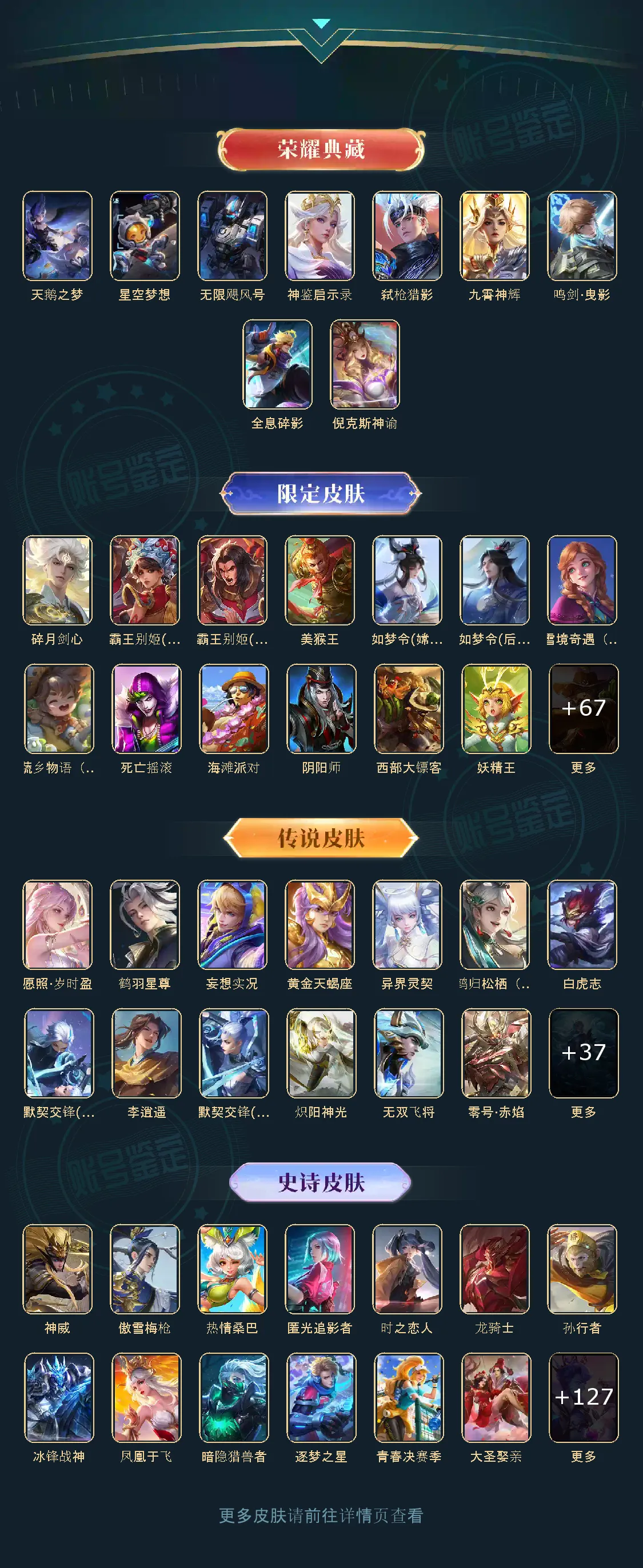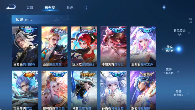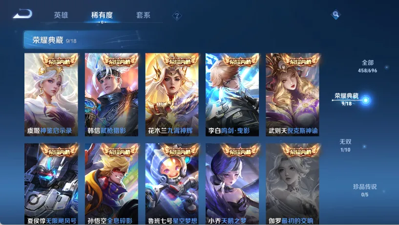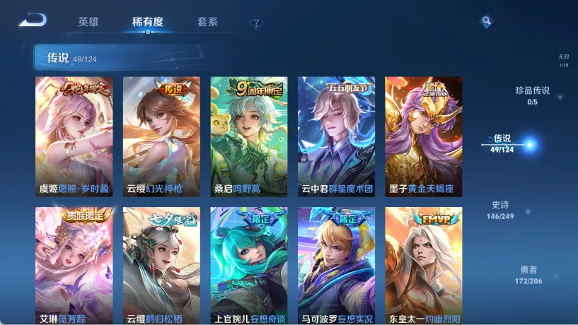 贵族等级V10,英雄数量124,典藏皮肤数9,皮肤数量458,