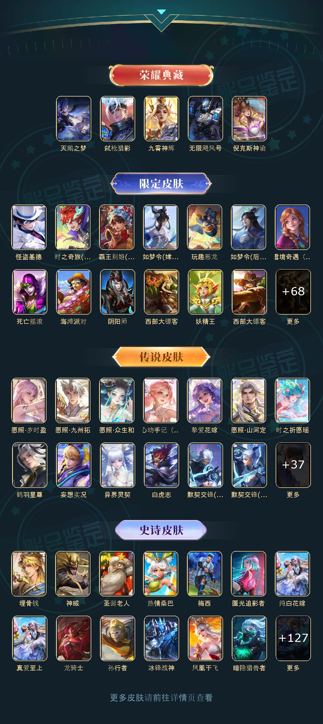 贵族等级V10,英雄数量125,典藏皮肤数5,皮肤数量448,天鹅之梦/无限飓风号/倪克斯神谕/补天