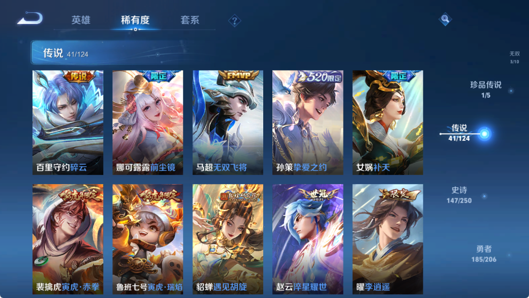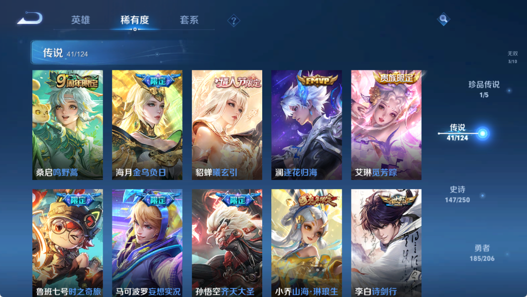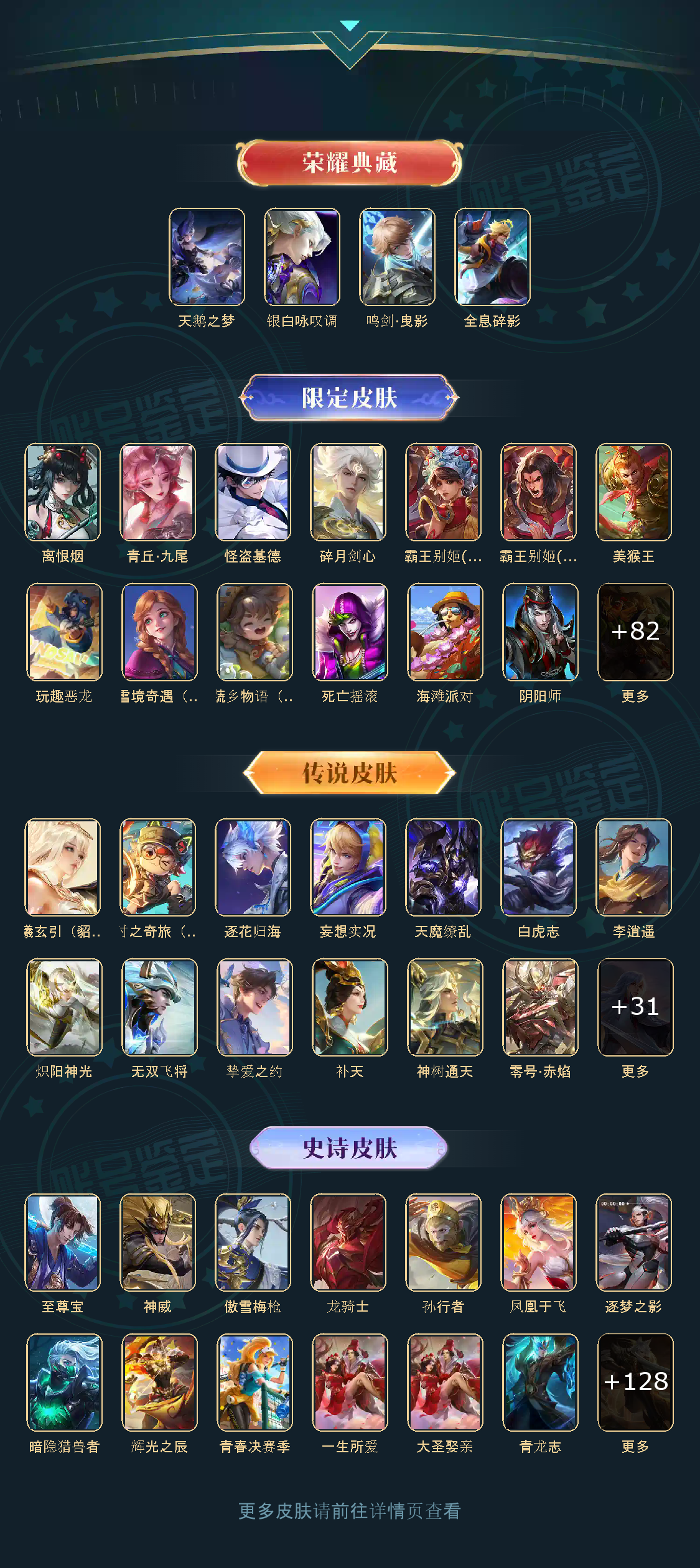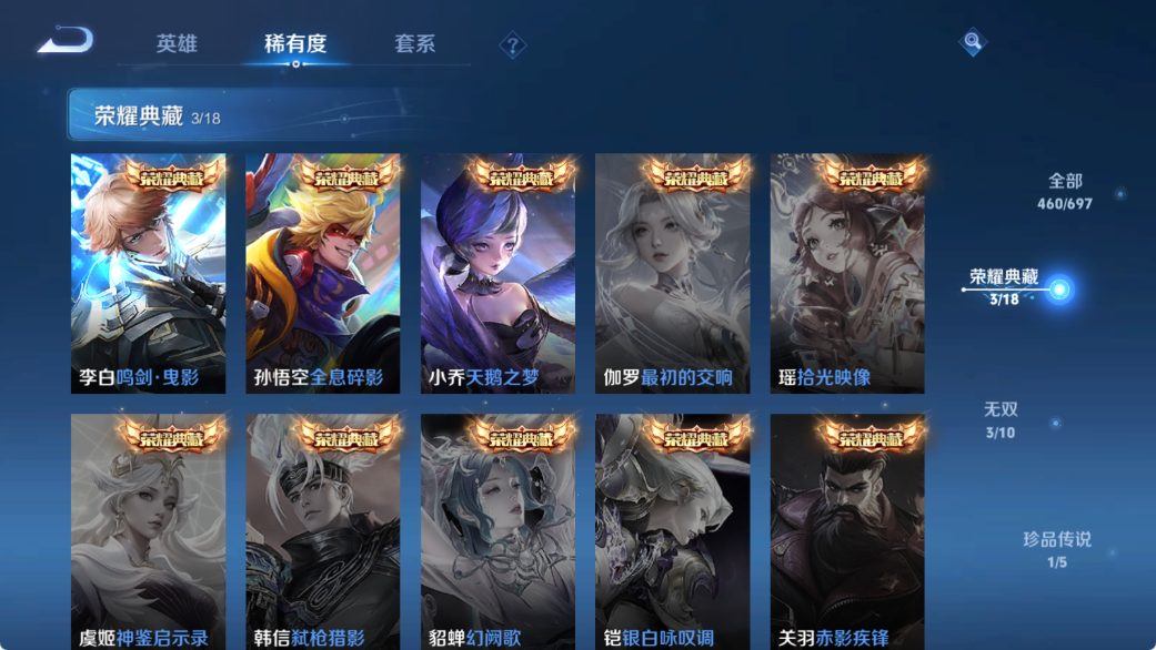 贵族等级V10,英雄数量124,典藏皮肤数3,皮肤数量460,天鹅之梦/全息碎影/鸣剑·曳影/李逍遥
