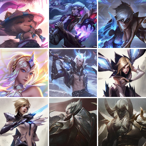 【传说皮肤】战地机甲厄加特 苹果机器人布里茨 战场女武神凯尔 女皇艾希 死亡骑士盖伦 约德尔国队长提莫 大天使长米迦勒凯尔 偶像歌手阿狸 冰川巨兽墨菲特 丧尸布兰德 女校长菲奥娜 上古战魂魔腾 星之守护者拉克丝 灵魂莲华瑟提 神龙尊者夜月幻龙亚索 神龙尊者昼日真龙亚索 红色男爵库奇 电玩女神娑娜 黎明使者永恩 光明哨兵薇恩 光明哨兵格雷福斯 源计划超体莫德凯撒 源计划泯灭雷克顿 地狱之门卫士加里奥 暗星尊烬 恶魔之刃泰达米尔 太空律动猫猫布里和里茨 冰霜之刃艾瑞莉娅 神龙尊者圣龙李青 黯晶凤凰艾尼维亚 灵魂莲华锤石 枯萎之壤泽拉斯 第三类接触黑默丁格 真实伤害艾克 双重冰晶艾尼维亚 耀星女神拉克丝 暗星女王拉克丝 苍穹之光韦鲁斯 星之守护者霞 星之守护者洛 烈焰雄心崔丝塔娜 冰霜亚龙希瓦娜 铁哥们儿奥拉夫 神王德莱厄斯 神王盖伦 霸天异形卡兹克 源计划林易 符文战熊沃利贝尔 源计划净化薇恩 最终BOSS维迦 银河魔装机神兰博 战地巨兽科加斯 黑夜使者亚索 黎明使者锐雯 鬼魂新娘莫甘娜 宇航员诺提勒斯 未来战士凯特琳 钢铁之翼凯尔 屠龙勇士潘森 炼狱魔犬内瑟斯 黯黑魔龙希瓦娜 恶魔男爵瑞兹 霸天零式赛恩 神拳李青 驯龙炮手崔丝塔娜 绅士科加斯 钢铁军团盖伦 灌篮高手德莱厄斯