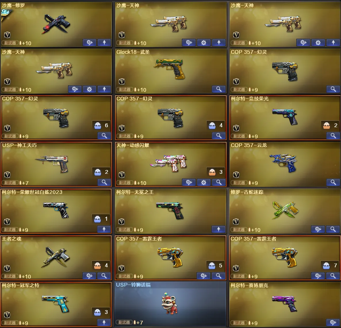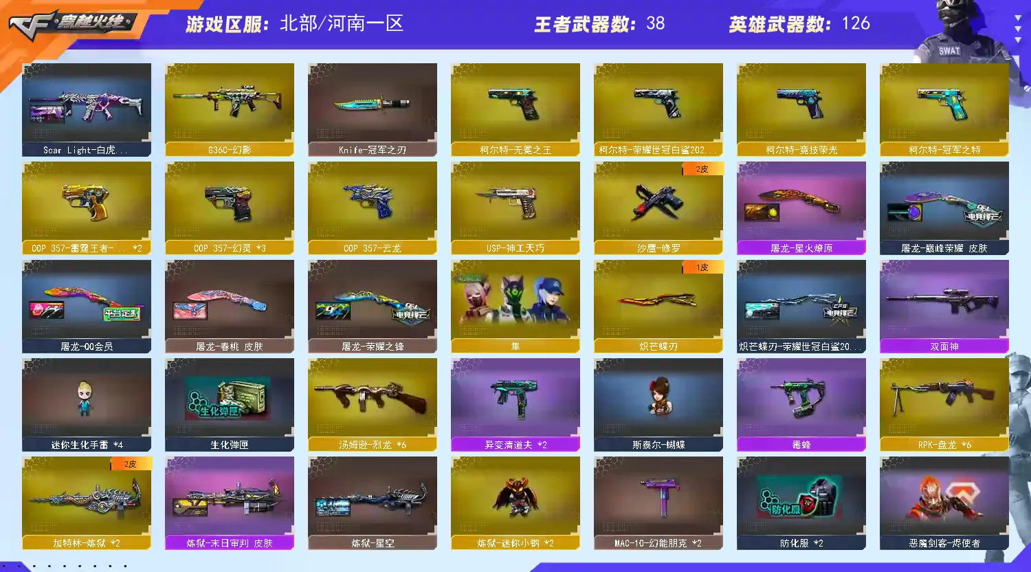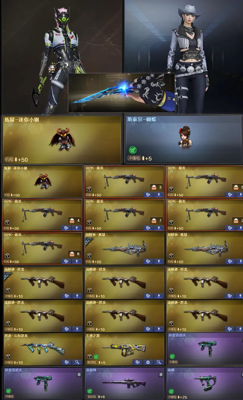 【其他重要武器】炫金黑龙/炫金千变/爆炎激光-超越MAX/激光毁灭者III-白马银枪/冰龙粉碎者-白马银枪/机甲撕裂者III/M14EBR-赤血龙魂(2)/AN94-青花瓷(2)/QBZ03-锋芒破茧(2)/AK-12-恶棍/AK47-丹龙(3)/QBZ03-吕布(2)/M4A1-Guitar 炫彩/AK47-破空冰刃/M4A1-S-能量核心(2)/M4A1-XS-耀龙/AK47-SS-枪王排位/AK47-祥云苍龙/AK47-盛典-CFS 2022/凤凰之魂/M4A1-紫狱/M4CQBR-AP-孔明/M4A1-PINK/M14EBR-炎龙/HK417-红龙/金色小号/M4A1-XS-赤龙/M4A1-电音/AK103-神秘黑洞/M4A1-SS-枪王排位/百城M4A1/M4A1-秘银赤龙/AK47-绚樱/9A91-赤血龙魂/AK47-苍龙/AK47-大帝林肯/AK47-齐天大圣/AK47-死亡之翼/QBZ03-烛龙/AK47-SS/M14EBR-情人节2020/M4A1-情人节2019/M4A1-齐天大圣/AK-47-A-波特博士/黄金AK-47/AK-47-二次元/9A-91-圣诞/M4A1-圣诞2021/神罚/98K-烛龙(2)/M200-萌杀/AWM-枪娘/Barrett-赤龙/AWM-小故障/AWM-蓝水晶/AWM-恶棍/巴雷特-情人节2020/蓝色魅影/AWM-恶棍-枪王排位/Barrett-耀龙/AWM-A-圣诞2021/AWM-盛典-CFS 2022(2)/M200-落樱/M200-朋克/M200-庆典-CFS 2021/Barrett-捣乱兔兔(3)/M200-青花瓷/双面神/M200-神秘黑洞/Barrett-孔明/M82A1-水枪-机甲核心/AWM-Pink(3)/AWM-万圣节刀锋/AWM-A枪王排位II/百城AWM/AWM-S/破天九龙/M200-青帝/M82A1-夏日/M200-牡丹/凤凰之力/破天狂龙/M200-WeGame/末日裁决者/KAC-圣炎切割者III/巨龙咆哮Ⅲ/KAC-情人节2021/阿梅利轻机枪-暗夜风暴/EVO III-赤血龙魂/EVOIII-萌杀/MK5-枪王排位/斯泰尔-巧克力/EVOIII- 曹操/异变清道夫(2)/CPW-动力-潘多拉/EVO3A1-火线13周年/试炼破坏者III/AA12-擎天柱/神圣爆裂者-末日/神圣爆裂者/SPAS-12-雷电核心/AA-12-圣龙/柯尔特-赛博朋克/阐释者III(2)/愤怒公牛左轮-枪王排位(2)/USP-黑大圣(2)/沙鹰-枪王排位(2)/新USP-枪王排位奖励(3)/沙鹰-青龙/COP-机甲刑天/Cop357-赤龙/COP357-十二生肖·羊/蟒蛇-炫彩(3)/毛瑟-庆典-CFS 2021/迷彩沙鹰-70KG(2)/COP 357-平天大圣/MAC-10-幻能朋克(2)/Cop357-萌杀(2)/柯尔特-百城/沙漠之鹰-盛典-CFS 2022/COP 357-青龙/凤凰之火/COP-金蝉子-枪王排位/毛瑟-玄龙/COP357-圣诞2021/Knife-冠军之刃/猫猫手套/魔能镰刀/虹光丛林匕首-枪王排位/黄金猫猫手套-白鲨/鹰爪-枪王排位/啸天/虹光女皇利刃-枪王排位/丛林匕首-枪王排位/雷神之怒-机甲核心(2)/蝴蝶刀-枪王排位/无畏之矛/虹光鹰爪-枪王排位/闪光弹-枪王排位(4)/胜利奖杯烟雾弹-枪王排位(3)/胜利奖杯闪光弹-枪王排位(4)/胜利奖杯手雷-枪王排位(3)