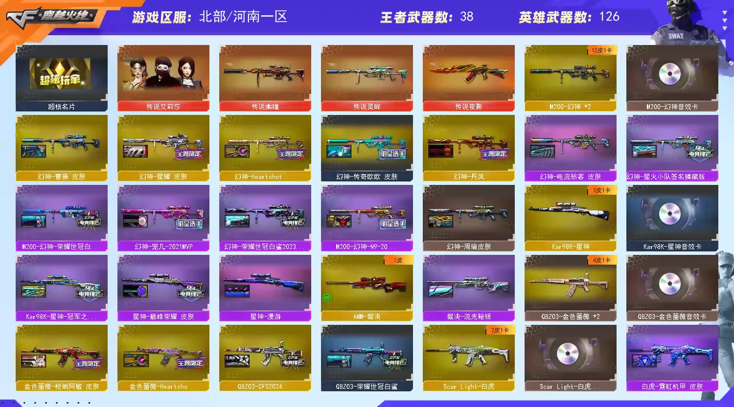 【重要武器皮肤】幻神-Heartshot 皮肤/幻神-电流骇客 皮肤/幻神-星火小队签名臻藏版 皮肤/幻神-欧欧 皮肤/M200-幻神-荣耀世冠白鲨/幻神-荣耀世冠白鲨2023 皮肤/M200-幻神-N9-2022MVP/幻神-宠儿-2021MVP/幻神-周瑜皮肤/幻神-曹操 皮肤/幻神-丹凤/幻神-星耀 皮肤/星神-巅峰荣耀 皮肤/Kar98K-星神-冠军之星皮肤/星神-漫游/毁灭-Heartshot皮肤/毁灭-冠军之怒/毁灭-星空/毁灭-枪娘巴雷特/毁灭-墨兰皮肤/毁灭-直播专属 /毁灭-纸鸢皮肤/毁灭-黑大圣皮肤/极光-能量核心/AWM-天龙-传奇70KG/天龙-能量核心/裁决-流光秘银/火麒麟-傲竹金蛇 皮肤/火麒麟-Heartshot皮肤/火麒麟-荣耀世冠AG/火麒麟-CFSTAR/火麒麟-/火麒麟-华夏之心/火麒麟-大唐荣光/火麒麟-巅峰荣耀/火麒麟-平天大圣/火麒麟-轻羽皮肤/火麒麟-冠军之心/M4A1-千变-孔明皮肤/雷神-源计划2.0专属 皮肤/雷神-刘备 皮肤/M4A1-雷神-白鲨皮肤/雷神-宠儿-2019MVP/雷神-传奇N9/雷神-荣耀之魄/雷神-虎将/雷神-炽焰魔龙/雷神-HeartShot 皮肤/黑骑士-地狱火/黑骑士耀金皮肤/黑骑士-少林/黑骑士-暗月/黑龙-能量核心/金色蔷薇-Heartshot皮肤/金色蔷薇-枪娘阿敏 皮肤/Scar Light-白虎-暗星/白虎-霓虹机甲 皮肤/天罚-孙权 皮肤/QBZ03-CFS2024 皮肤/QBZ03-荣耀世冠白鲨/超新星-兔兔战士 皮肤/烈龙-星空/炼狱-末日审判 皮肤/炼狱-星空/炼狱-月 皮肤/修罗-冠军之魂/修罗-CFSTAR/修罗-能量核心/修罗-15周年嘉年华 皮肤/麒麟刺-甜蜜糖果 皮肤/麒麟刺-月皮肤/麒麟刺-荣耀世冠白鲨/屠龙-巅峰荣耀 皮肤/屠龙-春桃 皮肤/屠龙-荣耀之锋/屠龙-/屠龙-星火燎原/擎天-傲竹金蛇 皮肤/擎天-冠军之击/龙啸-冠军之啸/龙啸-纸灯龙皮肤/炽芒蝶刃-荣耀世冠白鲨2023 皮肤