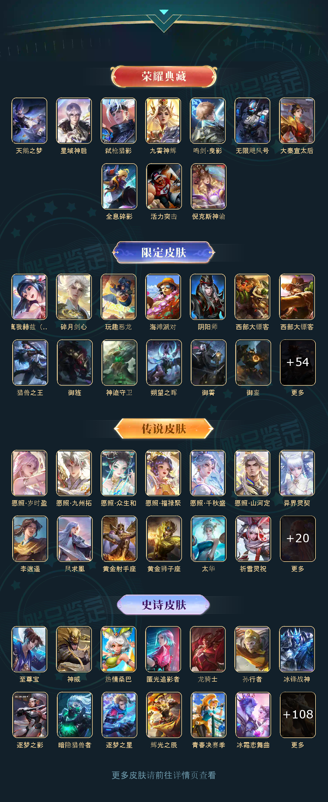 贵族等级V10,英雄数量124,典藏皮肤数10,皮肤数量392,