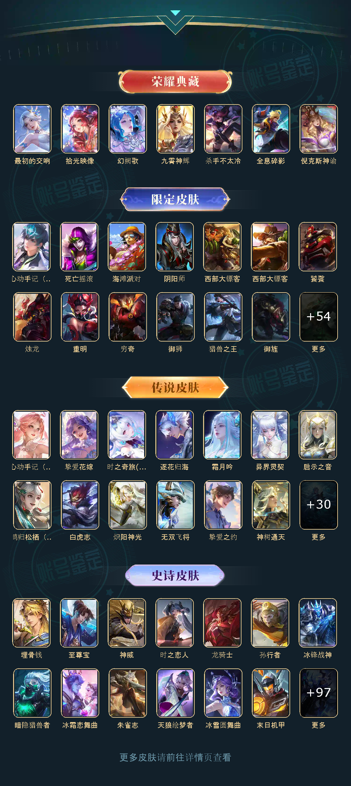 贵族等级V10,英雄数量124,典藏皮肤数6,皮肤数量362,杀手不太冷/全息碎影/倪克斯神谕