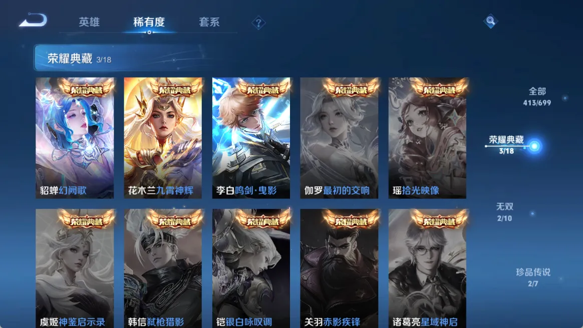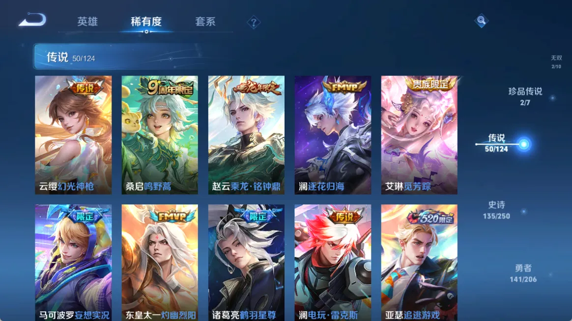 贵族等级V10,英雄数量124,典藏皮肤数3,皮肤数量431,鸣剑·曳影