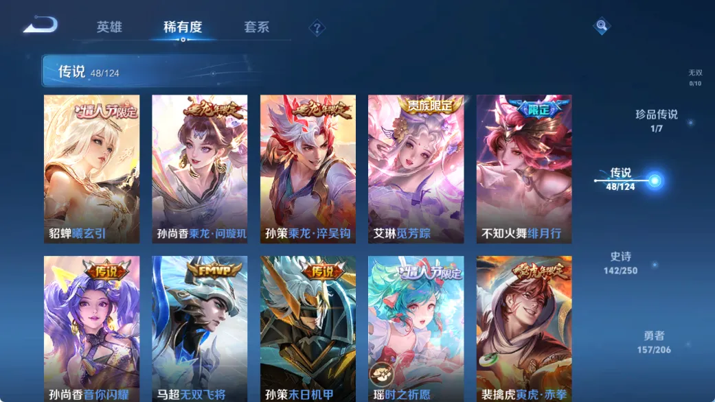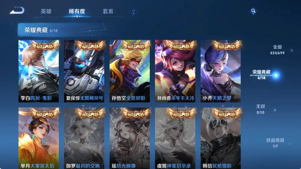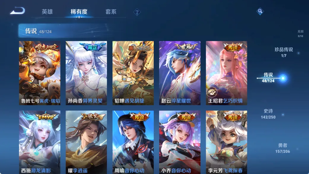 天鹅之梦,无限飓风号,鸣剑·曳影,幻阙歌,白虎志,李逍遥,默契交锋(花木兰),零号·赤焰,怪盗基德,炽阳神光,梅西,乘龙·问璇玑,乘龙·淬吴钩,至尊宝,神威,纯白花嫁,真爱至上,匿光追影者,无双飞将,时之祈愿瑶,曦玄引(貂蝉),异界灵契,傲雪梅枪