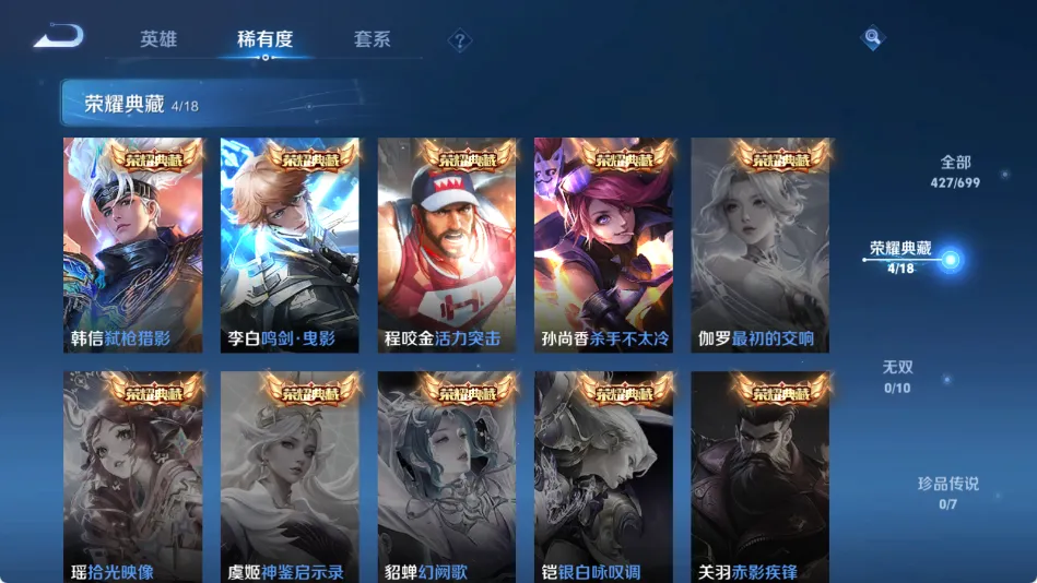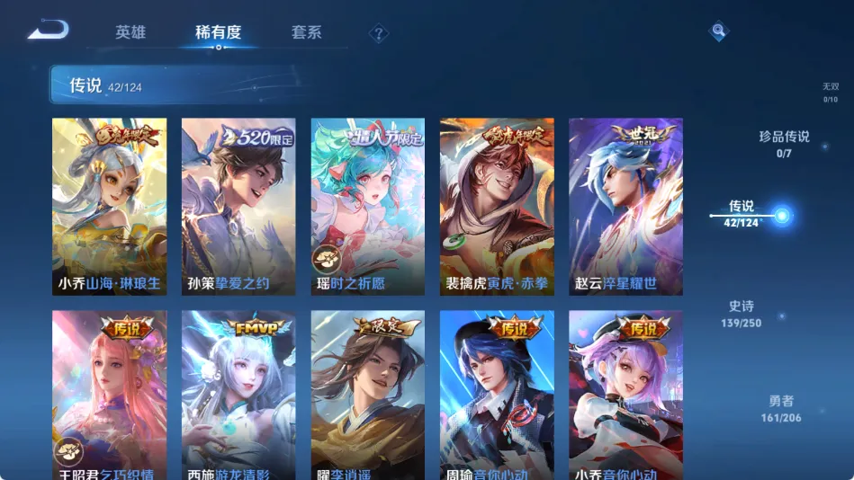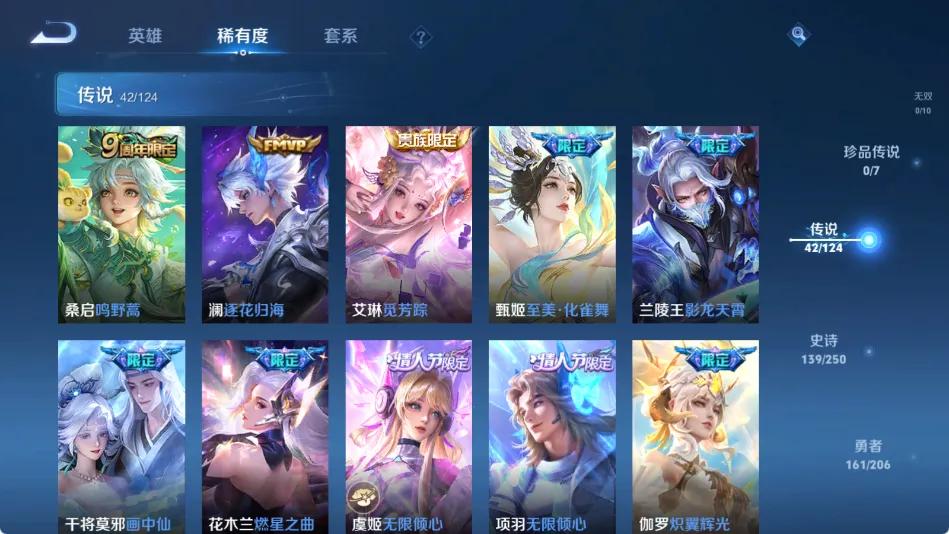 贵族等级V10,英雄数量126,典藏皮肤数4,皮肤数量435,冰锋战神街头霸王至尊宝杀手不太冷王者之锤凤求凰逐梦之影神奇女侠黄金狮子座一生所爱大圣娶亲白虎志朱雀志活力突击梁祝鸣剑·曳影龙胆李逍遥武圣奔雷神使孙行者神威淬星耀世时雨天司
