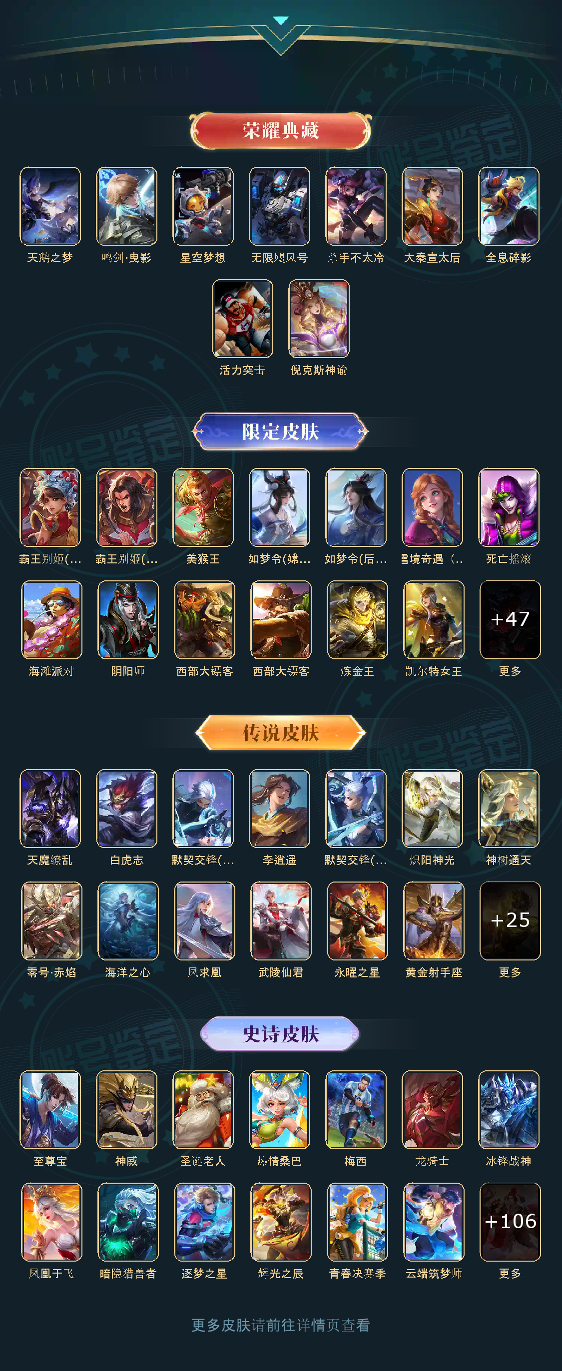 贵族等级V10,英雄数量124,典藏皮肤数9,皮肤数量386,天鹅之梦/杀手不太冷/大秦宣太后/星空梦想/无限飓风号/全息碎影/活力突击/倪克斯神谕/鸣剑·曳影