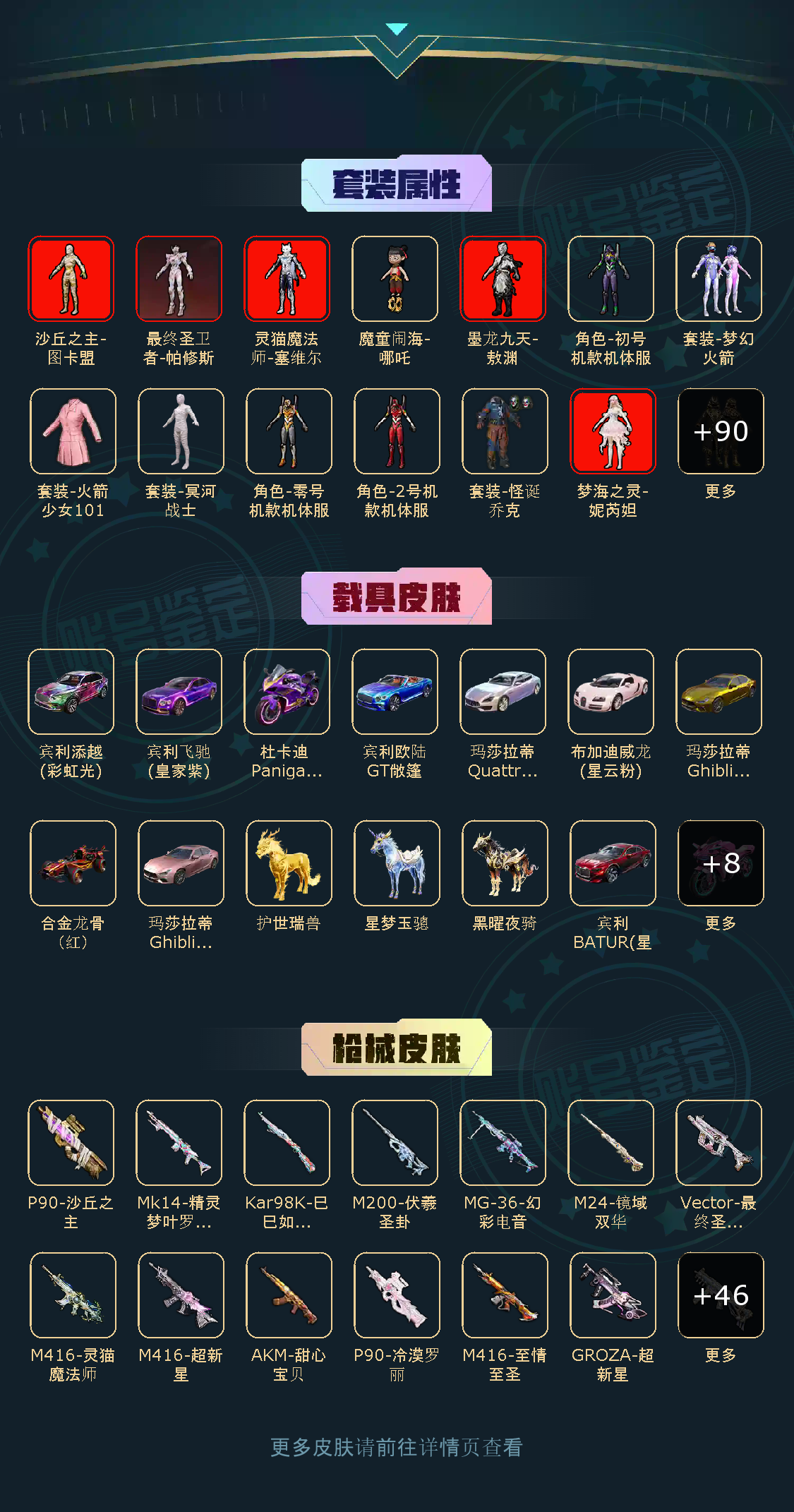 95粉,19载具,54特效枪,502套装,27王牌印记 UZI-绮梦青鸾AKM-甜心宝贝DP-28-扶摇飞仙SCAR-L-梦幻火箭SCAR-L-童趣迷兔Kar98K-伏魔团SKS-碧影闪光M416-风花雪月AUG-星之彼岸AWM-焰龙焚天M762-激战未来GROZA-香水柠檬M416-心之恋语平底锅-林间仙鹿M16A4-葫芦兄弟M416-五爪金龙DP-28-枪炮玫瑰AKM-炫紫旋律MG3-洛神天依S12K-海渊国主M762-甜蜜誓约UMP45-相思残雪M24-星之信仰M249-蓝莓炮弹玛莎拉蒂Ghibli(金)双人摩托-梦幻火箭鬼马风驰合金龙骨(红)玛莎拉蒂Ghibli(粉)快艇-塞莎KL27(鲸之蓝)