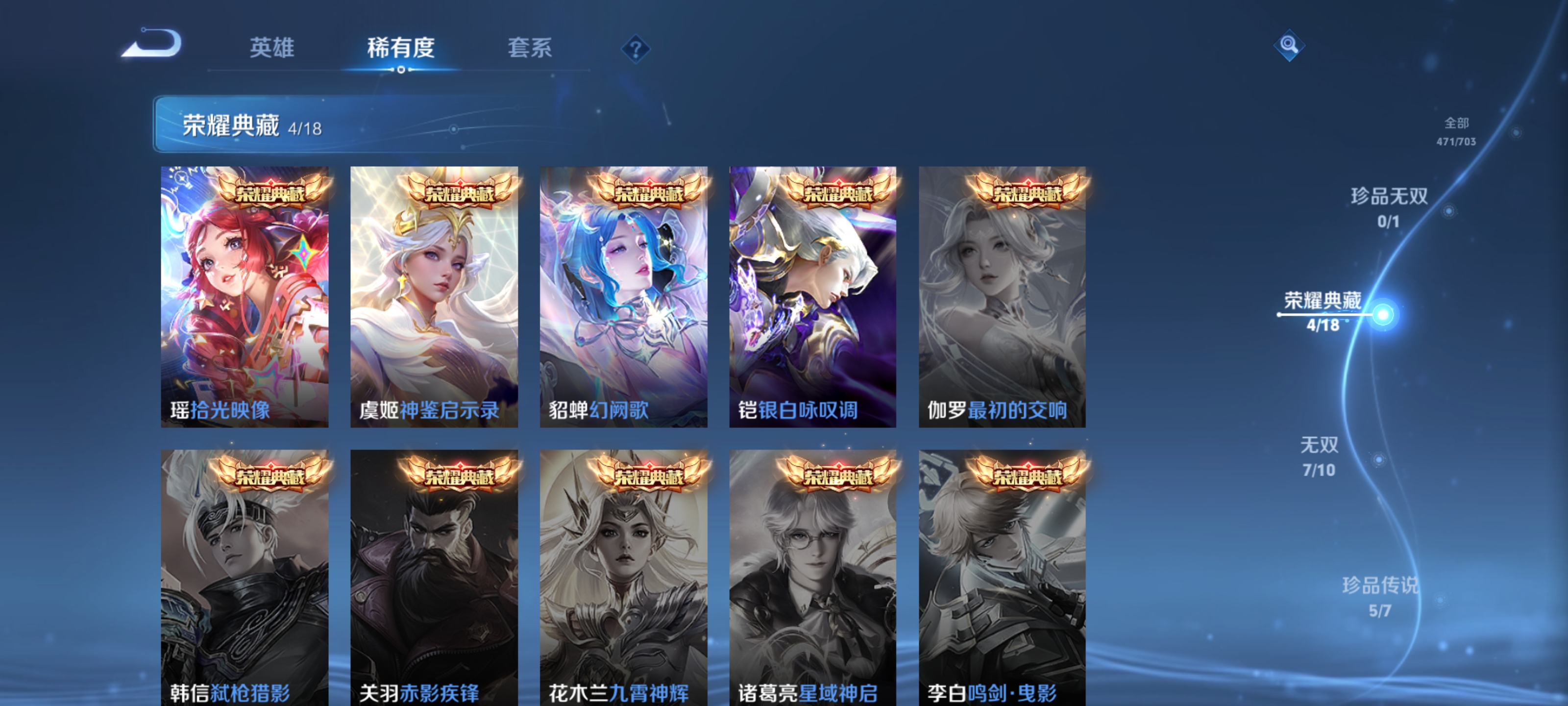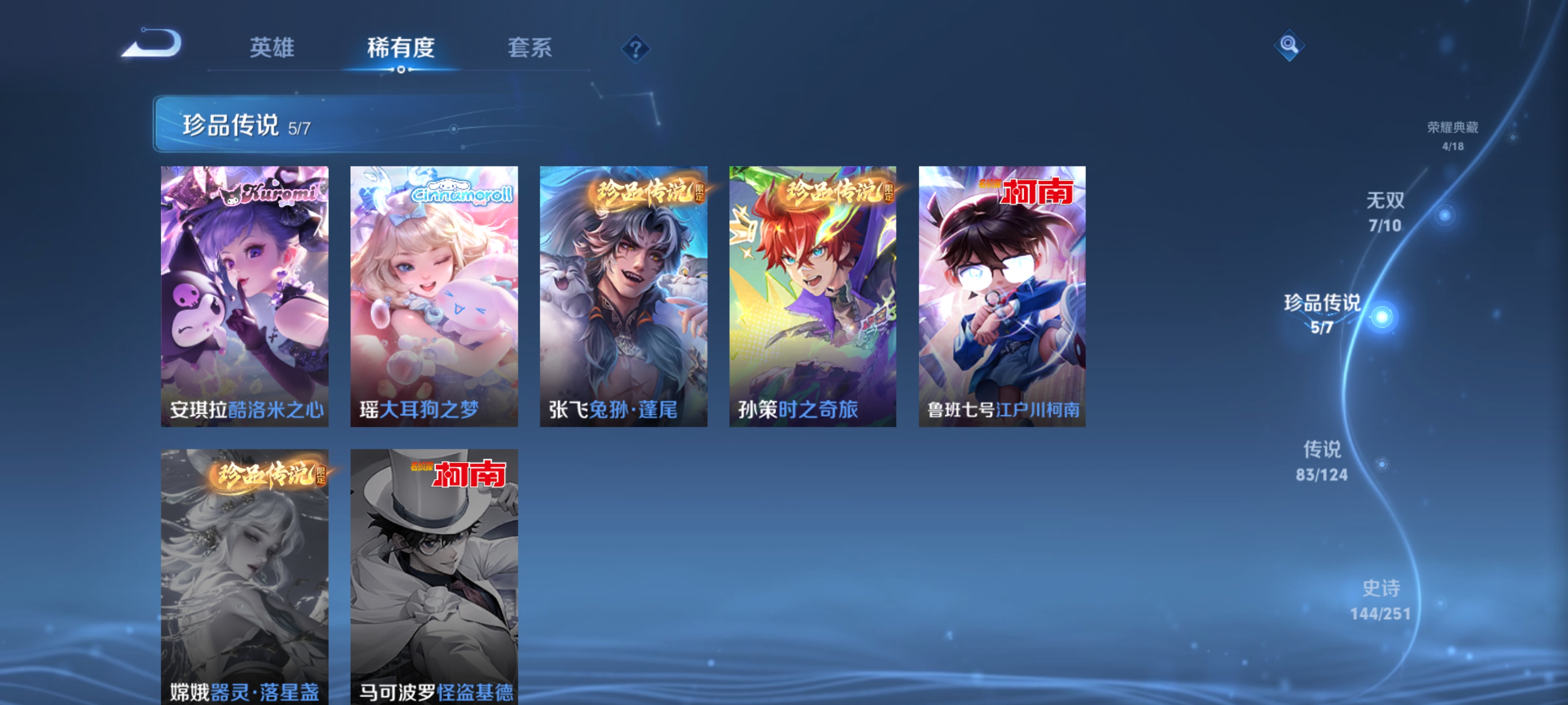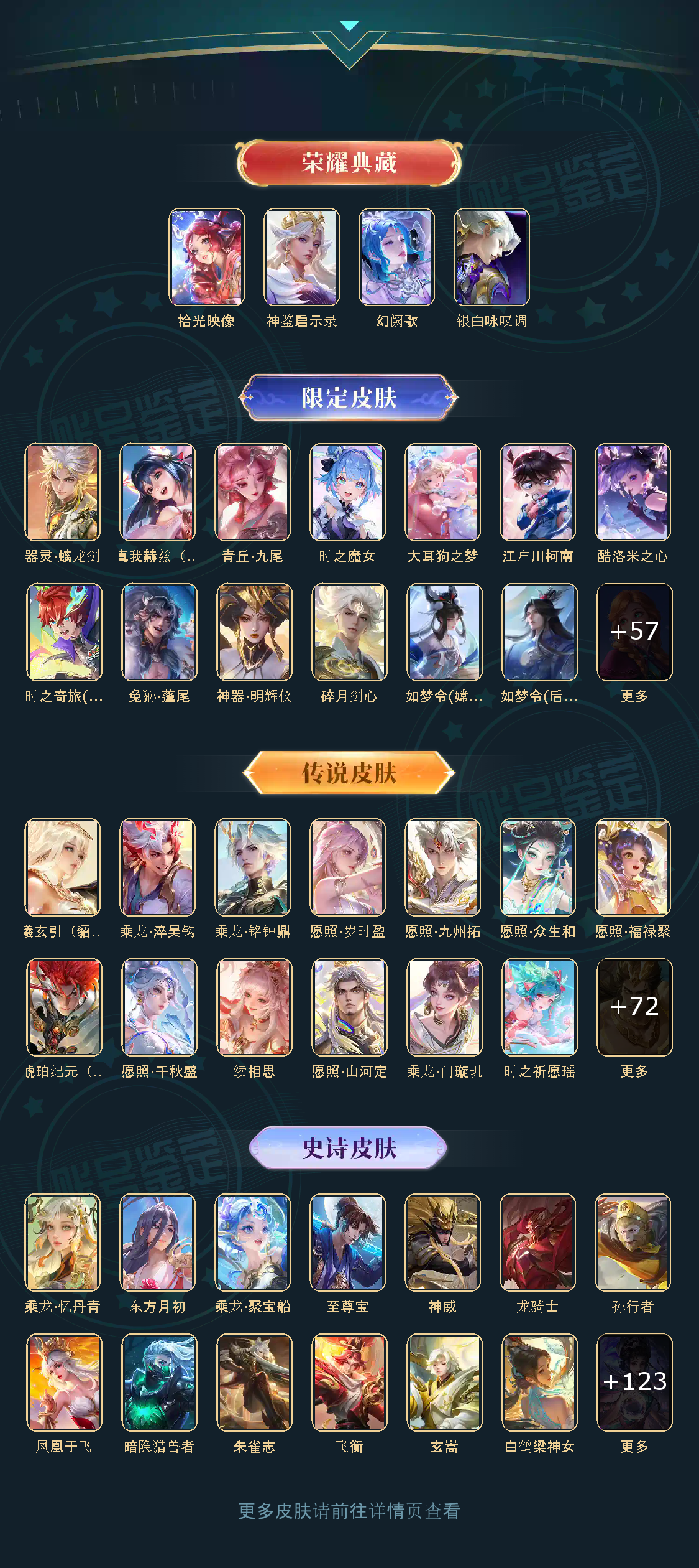 ,器灵·螭龙剑,愿照·九州拓,愿照·众生和,神器·明辉仪,乘龙·问璇玑,神鉴启示录,真我赫兹(瑶),愿照·福禄聚,无双飞将,时之祈愿瑶,遇见神鼓,涂山红红,逐花归海,琥珀纪元(马超),幻阙歌,琥珀纪元(伽罗),鹤羽星尊,时之奇旅(孙策),曦玄引(貂蝉),碎月剑心,愿照·千秋盛,霜月吟,雪境奇遇(甄姬),乘龙·淬吴钩,东方月初,拾光映像,乘龙·铭钟鼎,大耳狗之梦,黄金天蝎座,兔狲·蓬尾,愿照·岁时盈,乘龙·聚宝船,续相思,异界灵契,乘龙·忆丹青,青丘·九尾,江户川柯南,银白咏叹调,愿照·山河定,酷洛米之心,时之魔女