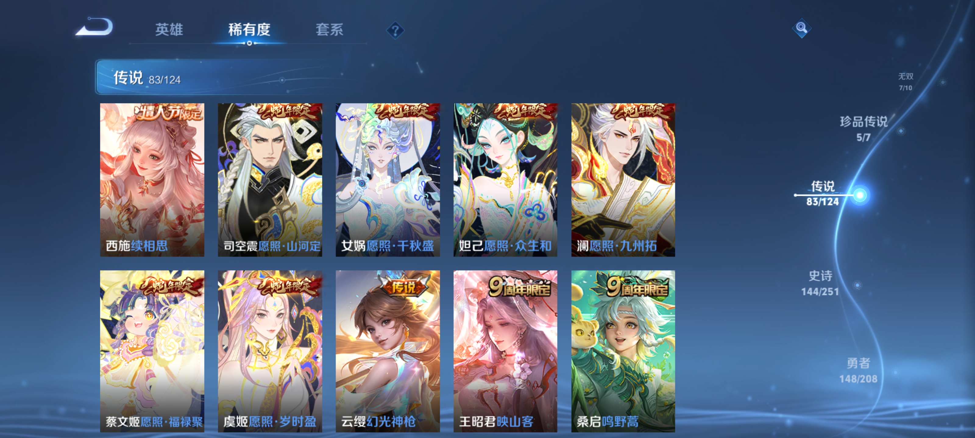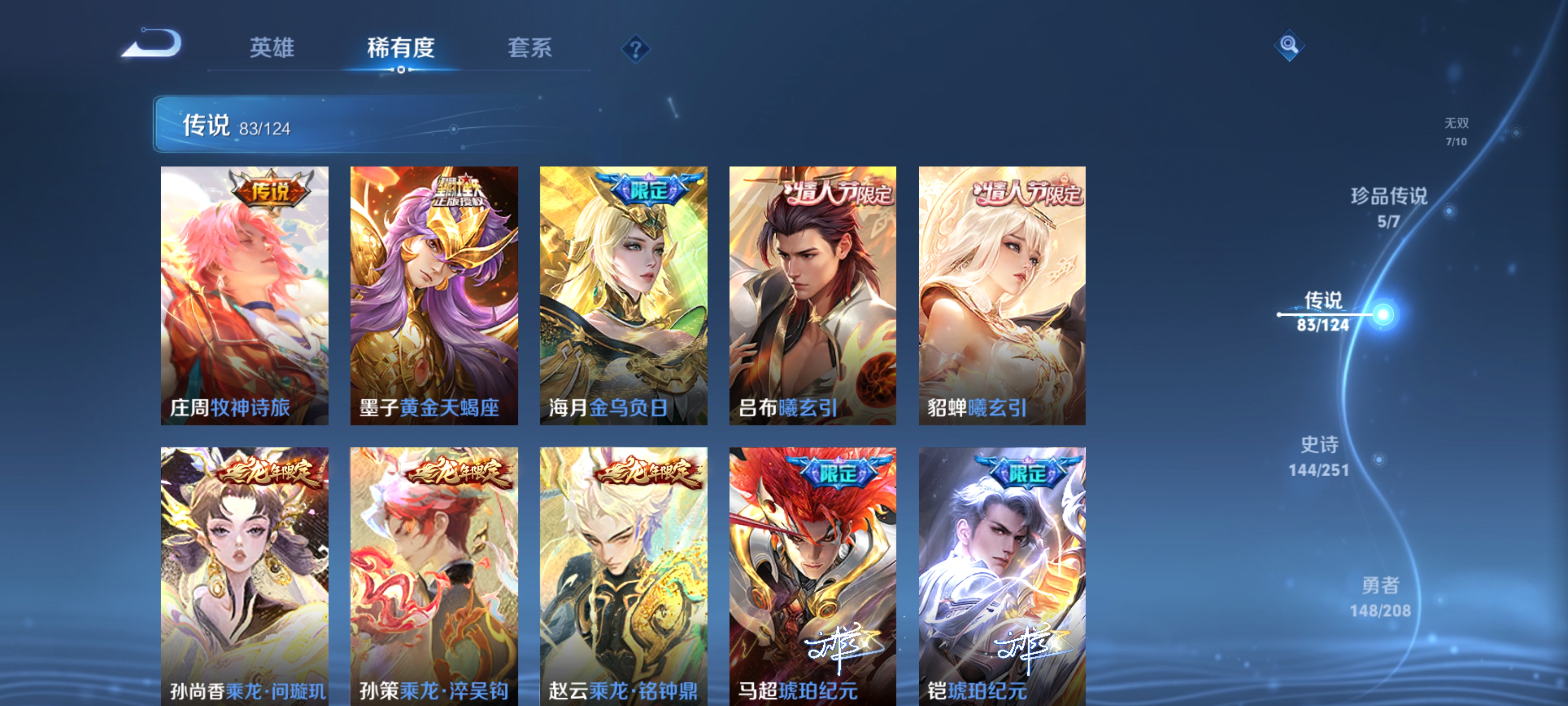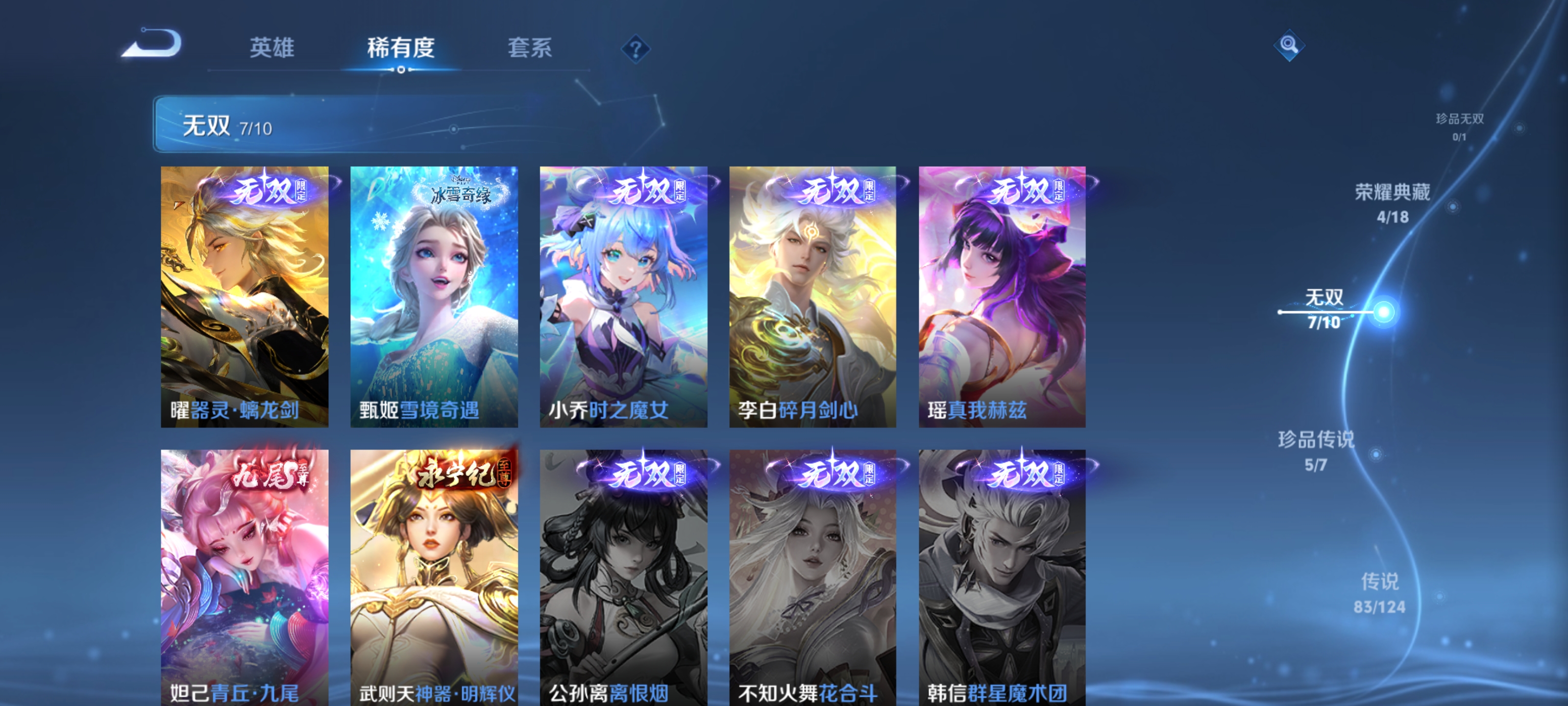 ,器灵·螭龙剑,愿照·九州拓,愿照·众生和,神器·明辉仪,乘龙·问璇玑,神鉴启示录,真我赫兹(瑶),愿照·福禄聚,无双飞将,时之祈愿瑶,遇见神鼓,涂山红红,逐花归海,琥珀纪元(马超),幻阙歌,琥珀纪元(伽罗),鹤羽星尊,时之奇旅(孙策),曦玄引(貂蝉),碎月剑心,愿照·千秋盛,霜月吟,雪境奇遇(甄姬),乘龙·淬吴钩,东方月初,拾光映像,乘龙·铭钟鼎,大耳狗之梦,黄金天蝎座,兔狲·蓬尾,愿照·岁时盈,乘龙·聚宝船,续相思,异界灵契,乘龙·忆丹青,青丘·九尾,江户川柯南,银白咏叹调,愿照·山河定,酷洛米之心,时之魔女