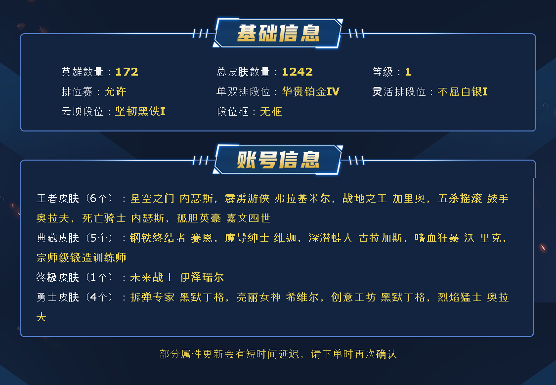 希望各位兄弟珍惜爱护此号,素质游戏,大家千万不要挂机逃跑,当成自己号来玩,输成什么样号主都能接受,如果故意逃跑或挂机肯定拉黑!【重要皮肤】T1杰斯至臻 幻灵战斗猫金克丝至臻 未来战士卢锡安至臻 灵魂莲华提莫至臻 源计划阴劫至臻 KDA阿狸至臻 KDA阿狸2022至臻 源计划正义艾瑞莉娅至臻 源计划正义艾瑞莉娅2022至臻 绒毛菲兹至臻 海克斯科技嘉文四世 恐惧新星德莱厄斯 胜利女神娑娜 舞会公主安妮 创星之灵璐璐 荣誉使者玛尔扎哈 电玩女神厄运小姐 电玩勇者锐雯 电玩女神阿狸 星之守护者伊泽瑞尔 女帝格温 玉剑传说无劫 玉剑传说翼剑仙 点心宝贝阿木木 龙的传人李青 天龙之子黛安娜 天龙之子迦娜 天龙之子卡莎 天龙之子李青 天龙之子伊泽瑞尔 天龙之子易 剪纸仙灵艾瑞莉娅 龙腾虎跃瑟提 替父从军花木兰 神龙烈焰金克丝 你看见过我的熊猫吗安妮 北辰之威内瑟斯 南天之怒沃里克 紫金罗刹莫甘娜 广寒仙子嫦娥 张辽文远 司马懿仲达 金猪烈焰瑟庄妮 胜利女神奥莉安娜 觅心游侠卢锡安 觅心之翼奎因 觅心萝莉金克丝 觅心猎手薇恩 寒冬精灵璐璐 圣诞捣蛋鬼金克丝 圣诞老人布隆 圣诞老人德莱文 冰雪风暴希维尔 狂心冰王图奇 冰雪女神辛德拉 魄罗骑士瑟庄妮 夺命美人卡特琳娜 平安夜女神娑娜 圣诞糖果棒厄运小姐 魅惑女巫艾尼维亚 魅惑女巫迦娜 魅惑女巫厄运小姐 魅惑女巫莫甘娜 魅惑女巫奈德丽 死亡誓约卡特琳娜 死亡誓约劫 灵魂收割者索拉卡 海之歌奈德丽 海之歌萨勒芬妮 泳池派对厄运小姐 泳池派对菲奥娜 泳池派对李青 泳池派对雷克顿 泳池派对瑟提 御星魔矢艾希 送披萨的小姐姐希维尔 克格汪 制胜金靴李青 DRX亚托克斯 DRX凯特琳 EDG厄斐琉斯 EDG佛耶戈 EDG格雷福斯 EDG悠米 EDG佐伊 DWG蕾欧娜 FPX李青 iG卡蜜尔 iG洛 iG卡莎 iG艾瑞莉娅 iG乐芙兰 iG菲奥娜 SSG伊泽瑞尔 SKTT1扎克 SKTT1娜美 SKTT1艾克 SKTT1奥拉夫 SKTT1瑞兹 SSW锤石 SSW泰隆 SSW图奇 SSW辛吉德 SKTT1贾克斯 SKTT1劫 SKTT1婕拉 SKTT1李青 暗杀星蒙多 暗杀星努努和威朗普 暗杀星伊泽瑞尔 暗杀星慎 Fnatic迦娜 Fnatic古拉加斯 Fnatic卡尔萨斯 冰雪节格雷福斯 冰雪节玛尔扎哈 冰雪节辛吉德 防暴士兵格雷福斯 防暴士兵辛吉德 防暴天使凯尔 钢铁之翼艾尼维亚 冠军典狱长锤石 冠军之刃锐雯2016 冠军之隐劫 鬼影森森茂凯 鬼影重重魔腾 海贼瑞兹 红桃杰克崔斯特 胡桃夹子萨科 惊悚派对费德提克 警用试作体K9内瑟斯 蓝色忧郁崔斯特 蒙多蒙多 密林猎手提莫 南瓜头费德提克 女猎手希维尔 圣诞精灵崔丝塔娜 圣诞开心鬼提莫 圣诞狂欢基兰 圣诞狂欢努努和威朗普 圣诞老人古拉加斯 圣诞玩偶波比 圣诞驯鹿克格莫 糖果使徒费德提克 外星装甲库奇 卧虎藏龙贾克斯 无头骑士赫卡里姆 喜庆之树茂凯 邪恶圣诞老人维迦 幸福女神乐芙兰 雪默丁格 雪装奈德丽 野兽猎人德莱文 野兽猎人瑟庄妮 野兽猎人泰达米尔 英勇玩具兵普朗克 勇者阿狸 勇者奈德丽 征服者卡尔玛 征服者诺提勒斯 暗影沃里克 机械迷城加里奥 诺斯费拉图弗拉基米尔 阿木木主人不要我了 波比的巧克力工坊 都铎王朝图奇 十五周年纪念希维尔 十周年纪念安妮 暗裔英雄盖伦 未来战士伊泽瑞尔