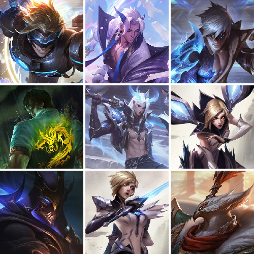 【传说皮肤】邪鸦魅影乐芙兰 血石领主弗拉基米尔 霸天零式赛恩 黎明使者永恩 黯晶凤凰艾尼维亚 女主播迦娜 黑夜使者亚索 战斗学院伊泽瑞尔 西部天使赛娜 驯龙炮手崔丝塔娜 星之守护者金克丝 源计划联合艾希 苍穹之光韦鲁斯 黎明使者锐雯 欧米伽小队幽灵特工 上古战魂魔腾 女警狙击凯特琳 源计划超体莫德凯撒 电玩女神娑娜 战斗学院凯特琳 青花瓷伊泽瑞尔 奥德赛凯隐 光明哨兵薇恩 真实伤害艾克 至高天派克 灵魂莲华锤石 提莫约德尔人的一大步 暗星尊烬 影执事劫 冰川巨兽墨菲特 陆地王者4WD布里茨 焰尾妖狐阿狸 源计划林易 枯萎之壤泽拉斯 地狱行者孙悟空 星之守护者洛 烈焰雄心崔丝塔娜 战地巨兽科加斯 金牌主播德莱文 苹果机器人布里茨 神龙尊者圣龙李青 恶魔之刃泰达米尔 泳池派对吉格斯 蔷薇绅士杰斯 钢铁之翼凯尔 铁哥们儿奥拉夫 大天使长米迦勒凯尔 魔幻卡牌崔斯特 绅士科加斯 符文战熊沃利贝尔 天煞劫 最终BOSS维迦 黯黑魔龙希瓦娜 宇航员诺提勒斯 律政大亨蒙多 双重冰晶艾尼维亚 地狱之门卫士加里奥 偶像歌手阿狸 女皇艾希 合金巨兽努努和威朗普 未来战士凯特琳 女校长菲奥娜 红色男爵库奇 神拳李青 星之守护者拉克丝 战场女武神凯尔 死亡骑士盖伦 第三类接触黑默丁格 恶魔男爵瑞兹
