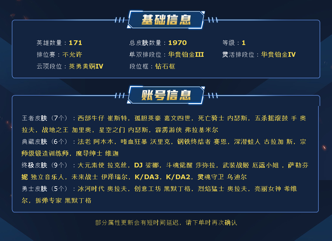 【毁号涉及毁坏虚拟财产罪及计算机安全罪】PS:本公司有专门的售后团队和法务部,如开挂、鼠标宏,第三方软件等原因造成账号封禁财产收到损害。安徽刀锋互娱配合起诉立案,必追责索赔到底。避免给自己带来不必要的麻烦,还请健康文明游戏!禁止开挂异常游戏 ⭐账号信息 ⭐店铺每天都会更新各种优质账号⭐喜欢可右上角收藏、方便下次租用。祝亲游戏愉快!!!【如遇上不了号咨询客服,客服24小时配合上号】
