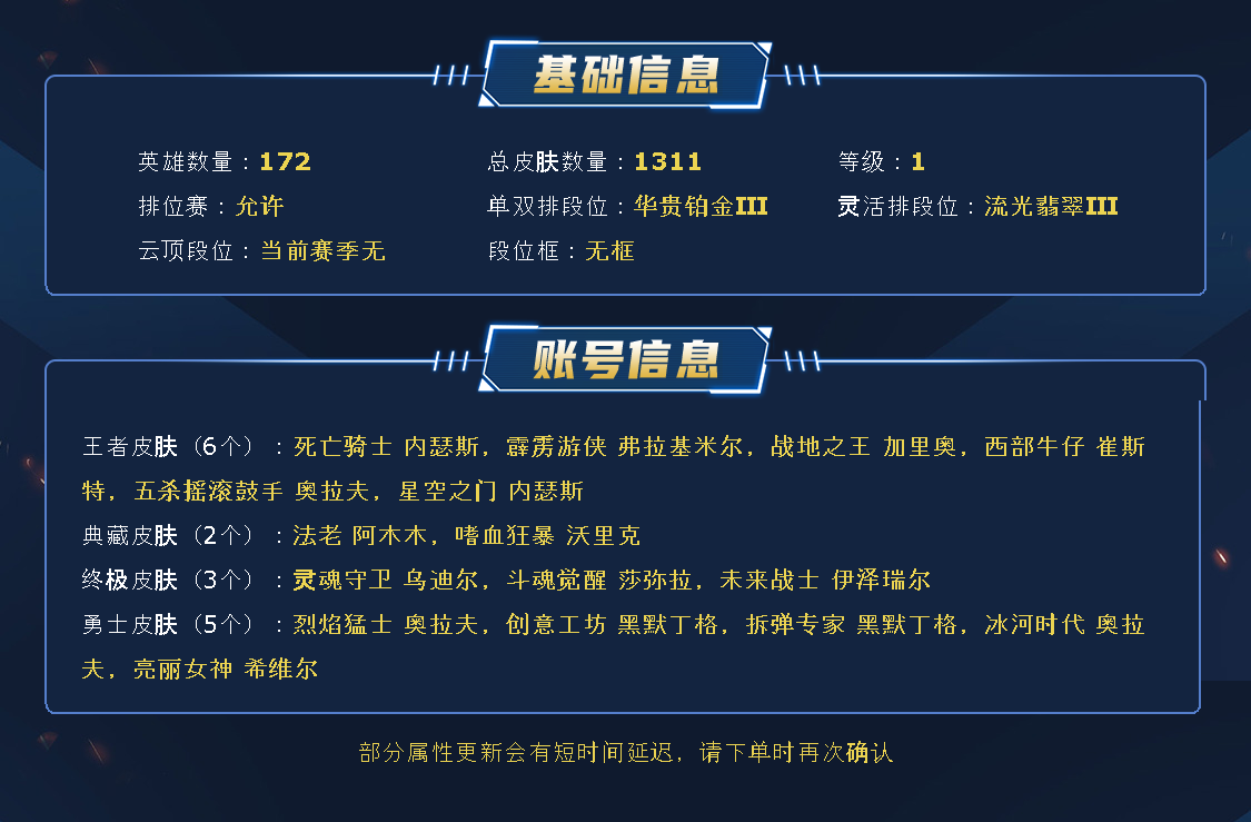 ~~喜欢记得收藏~~可排位~~1287皮全英雄~~租之前尽量查一下游戏ID,确保段位是您需要的,避免浪费您的时间~~请勿挂机逃跑故意送人头,谢谢合作,谢谢~~