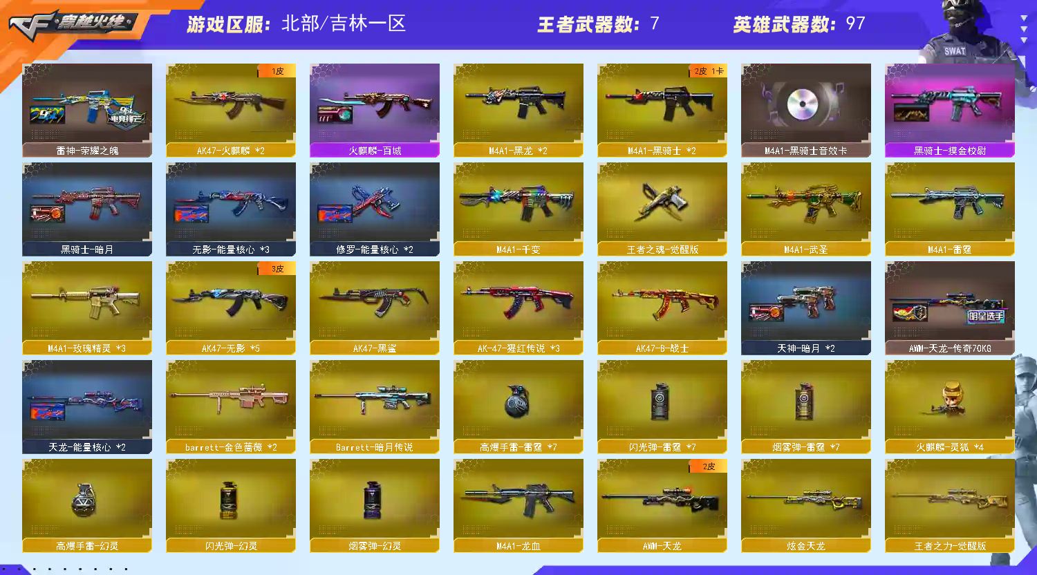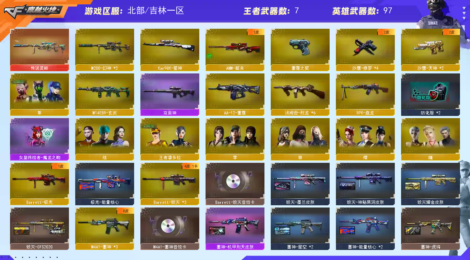 106V5王者9炫金可排位/传说灵眸/2把M200-幻神+雷霆之锋+7套雷霆雷/98K星神/玄武/1盘龙6烈龙/M4A1-黑骑士音效卡/极光-能量核心/毁灭-CFS2020/毁灭耀金皮肤/毁灭-墨兰皮肤/毁灭-神秘黑洞皮肤/AWM-天龙-传奇70KG/天龙-能量核心/雷神-荣耀之魄/雷神-虎将/雷神-机甲刑天皮肤/雷神-能量核心/雷神-星空/黑骑士-摸金校尉/黑骑士-暗月/火麒麟-CFSTAR/火麒麟-AG/火麒麟-百城/无影-能量核心/战神-流金岁月皮肤/战神-紫绶金章皮肤/修罗-CFSTAR/修罗-能量核心/天神-暗月/激光毁灭者3/炫金骑士/炫金武士/炫金黑龙/炫金超新星/炫金千变/炫金火麒麟/炫金天龙/炫金毁灭/王者之怒/炼狱-悦蓝/王者之魂/王者之锋/王者之力觉醒/雷霆之怒/王者之势觉醒/零/炫/隼/樱/葵/瞳/王者潘多拉/电竞少女/虎牙炫彩背包/超级背包3-7/