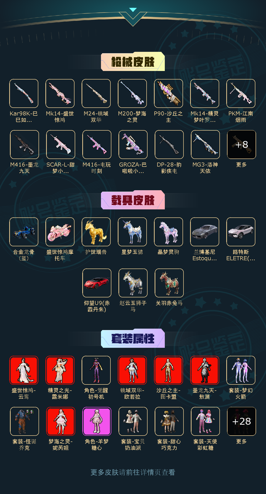 40粉,10载具,132套装,6王牌印记 M416-电玩时刻/SCAR-L-甜梦小狐/Mk14-盛世惊鸿/Kar98K-巳巳如意/GROZA-巴啦啦小魔仙/Mk14-精灵梦叶罗丽/M24-镜域双华/AKM-白勺歌姬/GROZA-精灵之光/MG3-洛神天依/M416-墨龙九天/AUG-许七安/M200-梦海之灵/PKM-江南烟雨/DP-28-千金淑猫/P90-沙丘之主/蜜獾-辉耀战甲/M16A4-晶梦幻蝶/破片手榴弹-粉粉猫爪/UMP45-启明星/护世瑞兽/仰望U9(赤霞丹朱)/星梦玉骢/兰博基尼Estoque(银翼灰)/合金龙骨(蓝)/关羽赤兔马/赵云玉狮子马/路特斯ELETRE(花绽灰)/晶梦灵驹/盛世惊鸿摩托车/