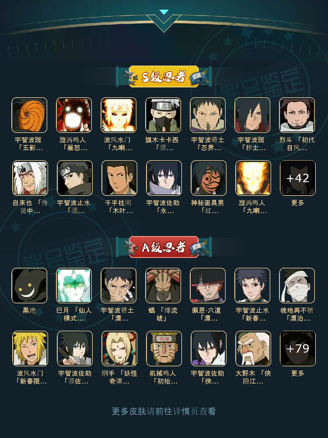 白面具 须佐卡卡西 小胡子鬼灯幻月 雷影 土影 无 佩恩 百战佩恩 青年柱间 创立初代 秽土斑 青年斑 解斑 须佐止水 虎皮 破面带土 红夜带土 罗砂 秽土三代风影 忍战雷影 三代雷影 金角银角 秽土半藏 忍战大野木 小土豆 天道超 大筒木桃式 大筒木金式 钢铁之躯凯 桀骜之刃阿斯玛 狂野之鲨鬼鲛 飞段 黑飞段 百豪樱 忍战李 大卡卡西 五代水影照美冥 宇智波鼬 仙鸣 九尾查克拉鸣人 鹰佐 奇拉比 青年艾 半蛇兜 晓蛇 新春鼬 面麻 须佐佐助 疾风咒印佐助 忍战宁次 忍战天天 最终章雏田 幻容卡卡西 神卡 忍战卡卡西 泳装卡卡西 忍战凯 青春哥 惊门凯 爱情哥 新春止水 新春水门 青年水门 青水 新春我爱罗 泳装照美冥 侠隐照美冥 侠隐纲手 侠隐兜 漂泊再不斩 漂泊佩恩 漂泊二代 漂泊小南 漂泊佩恩 三船 青年三船 青年长门 泳装南 新春南 黑绝 新春大蛇丸 晓创生角度 晓创生蝎 晓创生飞段 泳装鼬 鲛肌融合鬼鲛 新春迪达拉 秽土迪达拉 恶灵之影飞段 暴怒带土 忍战黄土 卑留呼 桃博 黑土 黑绝