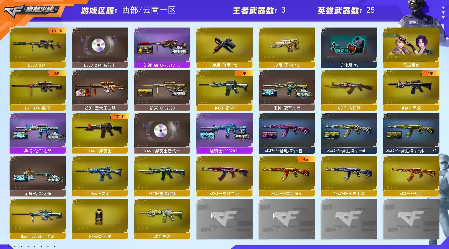 【m200幻神+幻神音效卡+ags17冠军皮肤】【黑骑士+黑骑士音效卡】【黑龙+冠军之武】【火麒麟 黑龙 雷神 黑骑士 青龙 死神雪域霜狐 猩红传说 战士 身先士卒 常胜将军 毁灭 暗月传说】——【热门武器/小人呛】【修罗 天神】【屠龙 龙啸 王者之啸】——【角色】【雪域霜狐 云海玲珑】