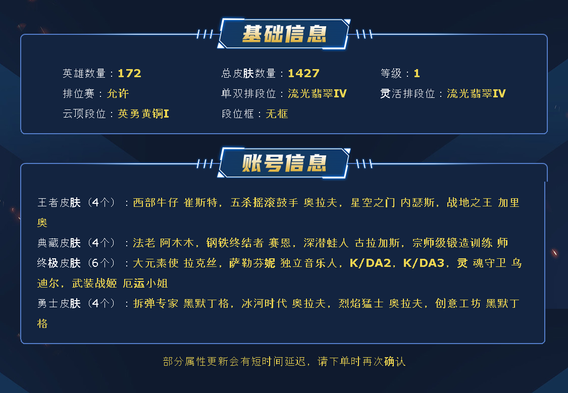 ~~喜欢记得收藏~~可排位~~1129皮全英雄~~租之前尽量查一下游戏ID,确保段位是您需要的,避免浪费您的时间~~请勿挂机逃跑故意送人头,谢谢合作,谢谢~~
