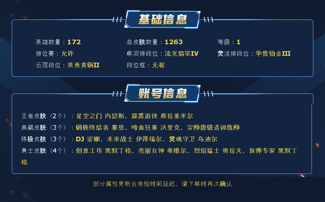 ~~喜欢记得收藏~~可排位~~1123皮全英雄~~租之前尽量查一下游戏ID,确保段位是您需要的,避免浪费您的时间~~请勿挂机逃跑故意送人头,谢谢合作,谢谢~~