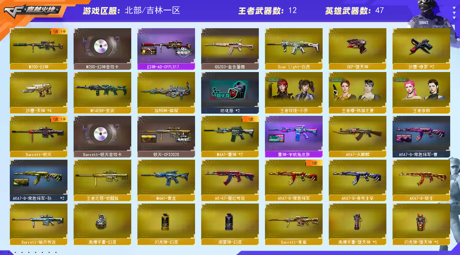 幻神三件套 幻神+AG-CFPLS17冠军+音效卡 王者之怒觉醒版 王者之影觉醒版 毁灭+CFS2020+音效卡 朱雀 白虎 玄武 QBZ金色蔷薇 COP堕天神 4天神 2修罗 雷神+宇航兔皮肤 火麒麟+CFSTAR 王者之啸觉醒版 王者之击觉醒版 王者之锋觉醒版 王者零传说之路 王者樱热浪之夏 王者玲珑小乔 王者涂鸦