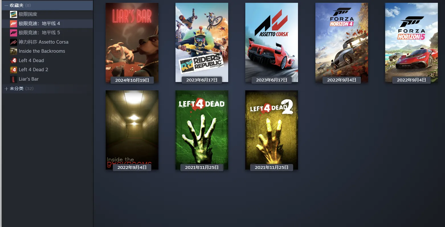 骗子酒吧、极限国度(Riders Republic)、极限竞速:地平线4终极版, 极限竞速:地平线5终极版、后室攻略/深入后室(Inside The Backrooms)、求生之路2、求生之路1、神力科莎豪华版(Assetto Corsa Ultimate Edition)