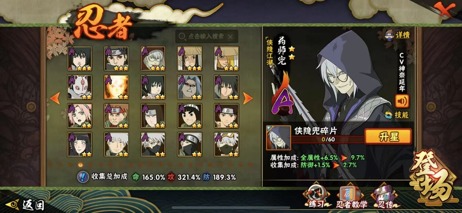 宇智波带土「漂泊浪客」宇智波泉奈 蝎「绯流琥」日向雏田「最终章」大蛇丸 「新春限定」不动 药师兜「侠隐江湖」旗木卡卡西 「幻之真容」宇智波鼬「夏日限定」漩涡博人「桃式显现」小南 「漂泊浪客」日向宁次 「忍界大战」角都 「秽土转生」我爱罗「新春限定」不缘 长十郎 「六代目水影」纲手「侠隐江湖」卑留呼 长门 「青年」佩恩·六道 「漂泊浪客」飞段 「晓创生」三船「青年」艾「青年」迪达拉「新春限定」照美冥「侠隐江湖」达鲁伊「博人传」不风 「忍者之路」神秘面具男 波风水门「青年」旗木卡卡西「元气夏日」干杮鬼鲛 「狂野鲛鲨」猿飞日斩「三忍之师」千手扉间「漂泊武士」奇拉比「忍界大战」宇智波止水「新春限定」天天「忍界大战」黑土「博人传」飞段「恶灵之影」猿飞阿斯玛「七夕限定」宇智波佐助「须佐能乎」加藤断 迈特凯「忍界大战」桃地再不斩「漂泊武士」迪达拉「秽土转生」小南「新春限定」蝎「晓创生」旗木卡卡西「忍界大战」宇智波带土「暴怒」猿飞木叶丸「博人传」照美冥「夏日泳装」漩涡鸣人「九尾查克拉」角都「晓创生」千代「近松十人卫」黄土「忍界大战」干柿鬼鲛「鲛肌融合」药师兜「半蛇斗篷」宇智波鼬「新春限定」地陆 宇智波佐助「疾风传咒印」我爱罗「忍界大战」小南「夏日泳装」秋道丁次「忍界大战」大蛇丸「晓」三船春野樱「百豪」勘九郎「忍界大战」照美冥「五代目水影」绝 猿飞日斩「火影继承人」迈特凯「惊门」达鲁伊 宇智波佐助「万花筒写轮眼」志村团藏 奇拉比 漩涡鸣人「仙人模式」角都「地怨虞」旗木卡卡西「万花筒写轮眼」小南 宇智波止水 干柿鬼鲛 猿飞阿斯玛 迈特凯 阿飞 蝎「百机操演」蝎 桃地再不斩 迪达拉 波风水门「新春限定」猿飞阿斯玛「秽土转生」旗木卡卡西 我爱罗「疾风传」飞段 角都 飞段「死司凭血」宇智波鼬 李洛克 「忍界大战」宇智波佐助「侠隐江湖」