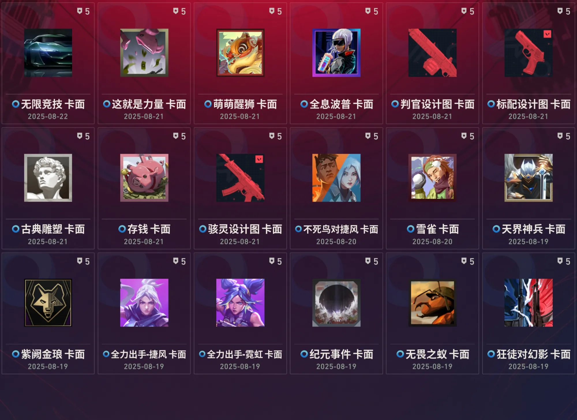 狂徒:冰点凝冻狂徒满级(冰点狂徒冰点ak)/炽鳞巡游狂徒4级粉色/水晶誓约狂徒4级虚空虹贝(水晶狂徒)/耀鳞威龙狂徒4级银色/全息波普狂徒4级红色(全息狂徒电幻狂徒)/盖世英雄狂徒4级幽月(猴子狂徒猴子ak)/艾沃莉的梦之翼狂徒4级粉红(艾沃莉狂徒猫猫狂徒猫猫ak)/狂沙噬天狂徒4级天穹黑曜(狂沙狂徒)/光明哨兵狂徒4级红绿蓝紫(光明狂徒)/极速光追狂徒满级黄色蓝色(显卡狂徒显卡ak)/偃月苍龙4级莹白玄青(偃月狂徒)/堕天遗武狂徒4级金色(堕天狂徒弃王狂徒弃王ak)/盖亚的复仇4级全炫彩(盖亚狂徒盖亚ak)/起源狂徒4级全炫彩/紫阙金琅狂徒4级全炫彩(紫金狂徒紫金ak)/猩红猛兽狂徒满级/无人之境狂徒全炫彩/巨神铁甲狂徒
