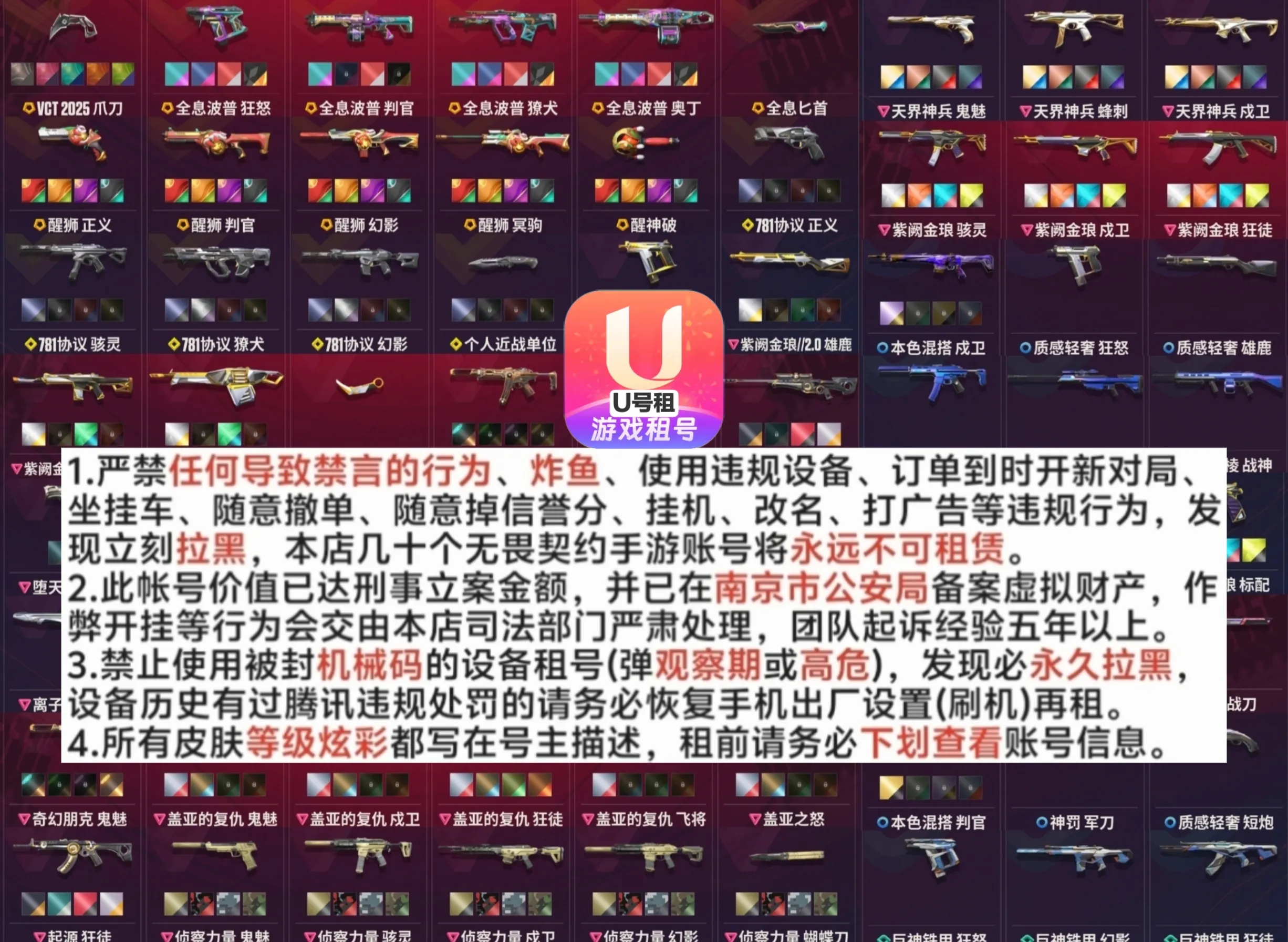 1.严禁任何导致禁言的行为、炸鱼、使用违规设备、订单到时开新对局、坐挂车、随意撤单、随意掉信誉分、挂机、改名、打广告等违规行为,发现立刻拉黑,本店几十个无畏契约手游账号将永远不可租赁。