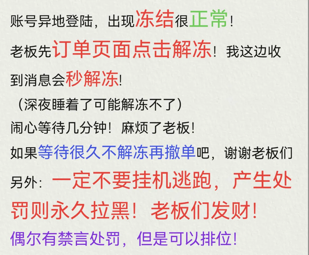 首先非常感谢您的选择!请及时续租不要挂机。快到时间了就不要再进游戏了,导致禁赛的一律拉黑,若是游戏中异地冻结,请点击解除冻结,我们会马上解冻,但是有时订单较多或系统有一定延迟,还请您耐心等待几分钟再登录,不要急着撤单 感谢!要不然下一单可能还是会冻结反而更浪费时间!