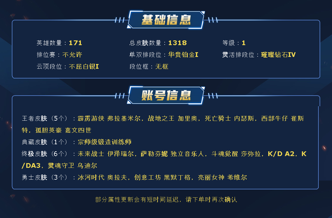 ~~喜欢记得收藏~~可排位~~1309皮全英雄~~租之前尽量查一下游戏ID,确保段位是您需要的,避免浪费您的时间~~请勿挂机逃跑故意送人头,谢谢合作,谢谢~~