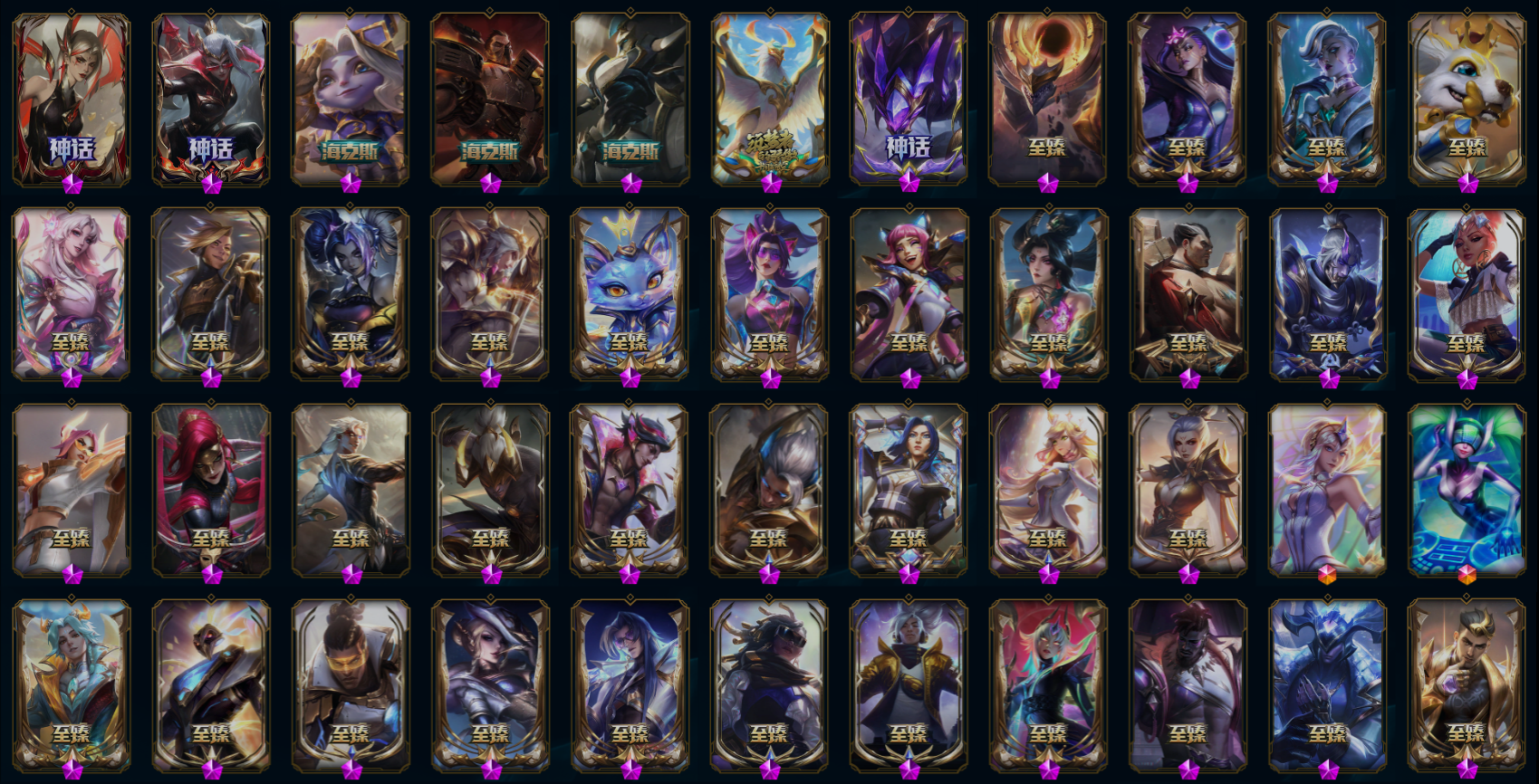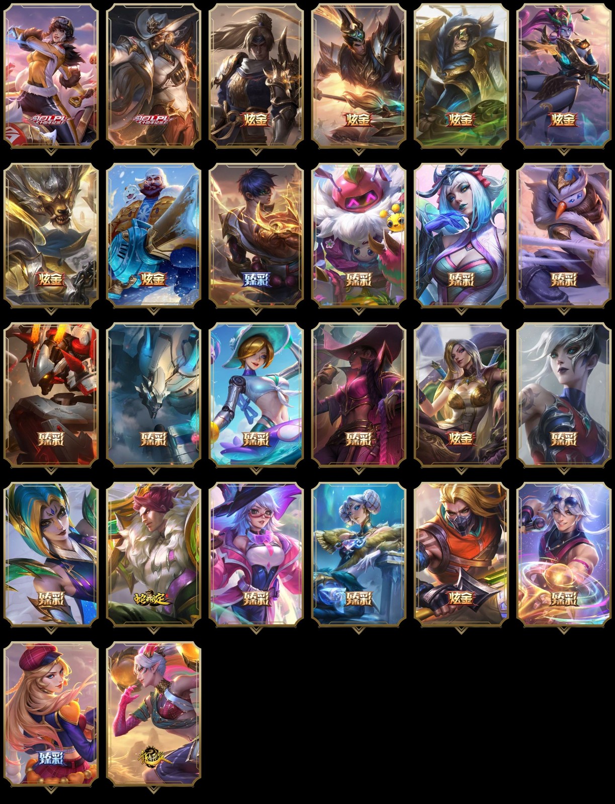 【重要皮肤】殿堂传奇卡莎 殿堂传奇阿狸 灵魂莲华劫至臻 灵魂莲华拉克丝至臻 凯旋将军德莱厄斯至臻 剪纸仙灵卡西奥佩娅至臻 黑色玫瑰假面舞会卡特琳娜至臻 双城之战2指挥官凯特琳至臻 暗星女王黛安娜至臻 魔域梦魇泽丽至臻 T1杰斯至臻 幻灵狮心蕾欧娜至臻 人工智能悠米至臻 至高天凯尔至臻 西部魔影伊芙琳至臻 天龙之子伊泽瑞尔至臻 神龙尊者比翼之龙洛至臻 北极星钢影卡蜜尔至臻 心之钢永恩至臻 DRX亚托克斯至臻 至高天奎桑提至臻 幻灵战斗猫金克丝至臻 女帝黛安娜至臻 未来战士卢锡安至臻 真实伤害亚索至臻 真实伤害赛娜至臻 星之守护者索拉卡至臻 灵能特工伊泽瑞尔至臻 福牛守护者菲奥娜至臻 暗星墨菲特至臻 神龙尊者炎龙瑟提至臻 黑夜使者凯隐至臻 KDA二代卡莎至臻 KDA伊芙琳至臻 KDA伊芙琳2022至臻 KDA阿卡丽至臻 KDA阿卡丽2022至臻 真实伤害奇亚娜至臻 真实伤害奇亚娜2022至臻 绒毛菲兹至臻 绒毛菲兹2022至臻 玉剑传说武剑仙至臻 玉剑传说武剑仙2022至臻 未来战士锤石至臻 黑夜使者李青至臻 黑夜使者李青2022至臻 殿堂传奇薇恩 殿堂传奇乐芙兰 海克斯科技阿利斯塔 海克斯科技崔丝塔娜 水晶掠夺者卡兹克 永恒之森奥恩 恐惧新星德莱厄斯 零之枪骑赫卡里姆 胜利剑圣易 胜利女神娑娜 胜利女神希维尔 胜利之王泰达米尔 胜利巨口克格莫 舞会公主安妮 勇敢的心德莱厄斯 电玩勇者锐雯 星之守护者伊泽瑞尔 玉剑传说无影 玉剑传说舞龙卫 灵能特工易 黎明使者薇恩 点心宝贝阿木木 龙的传人李青 天龙之子斯莫德 天龙之子易 剪纸仙灵婕拉 替父从军花木兰 神龙烈焰金克丝 碧玉之牙卡西奥佩娅 你看见过我的熊猫吗安妮 北辰之威内瑟斯 南天之怒沃里克 玉净夜叉凯特琳 广寒仙子嫦娥 张辽文远 司马懿仲达 烈焰美人薇恩 王国机神苍狼瑟提 王国机神白虎贾克斯 福牛守护者德莱厄斯 福牛守护者嘉文四世 胜利女神瑟庄妮 胜利之树茂凯 胜利机器人布里茨 胜利女神奥莉安娜 胜利枪神格雷福斯 胜利枪神卢锡安 胜利女神莫甘娜 胜利之剑亚托克斯 怦然心动凯特琳 幽梦玫瑰伊莉丝 甜心之翎洛 甜心宝贝安妮 穿心之剑菲奥娜 觅心游侠卢锡安 觅心女王艾希 北极星发明家塞拉斯 北极星使者彗 北极星神黛安娜 冬季仙境奥莉安娜 圣诞捣蛋鬼金克丝 冰雪驯鹿波比 持胡萝卜的雪人易 狂心冰王图奇 冰封王子蒙多 魄罗骑士瑟庄妮 夺命美人卡特琳娜 平安夜女神娑娜 圣诞糖果棒厄运小姐 魅惑女巫奈德丽 魅惑女巫伊莉丝 灵魂收割者索拉卡 小恶魔菲兹 泳池派对奥莉安娜 泳池派对塔莉垭 泳池派对格雷福斯 泳池派对李青 斩星魔剑易 送披萨的小姐姐希维尔 制胜金靴李青 制胜金球拉莫斯 DRX亚托克斯 DRX茂凯 EDG悠米 EDG佐伊 DWG凯南 DWG奈德丽 FPX薇恩 FPX李青 iG洛 SSG洛 SKTT1烬 SKTT1辛德拉 SKTT1奥拉夫 SKTT1阿利斯塔 SKTT1瑞兹 SKTT1伊莉丝 SSW雷恩加尔 SSW泰隆 SSW图奇 SSW辛吉德 SKTT1劫 SKTT1婕拉 SKTT1李青 SKTT1薇恩 暗杀星蒙多 暗杀星努努和威朗普 暗杀星伊泽瑞尔 暗杀星慎 Fnatic迦娜 Fnatic库奇 Fnatic古拉加斯 Fnatic卡尔萨斯 冰雪节格雷福斯 冰雪节玛尔扎哈 冰雪节辛吉德 冰雪兽纳尔 防暴士兵辛吉德 防暴天使凯尔 钢铁之翼艾尼维亚 冠军典狱长锤石 冠军掠夺者卡兹克 冠军之刃锐雯 冠军之刃锐雯2016 冠军之血希瓦娜 鬼影森森茂凯 鬼影重重魔腾 海贼瑞兹 胡桃夹子萨科 惊悚派对费德提克 蓝色忧郁崔斯特 密林猎手提莫 南瓜头费德提克 破空枪骑孙悟空 圣诞精灵崔丝塔娜 圣诞开心鬼提莫 圣诞狂欢基兰 圣诞狂欢努努和威朗普 圣诞老人古拉加斯 圣诞玩偶波比 圣诞驯鹿克格莫 糖果使徒费德提克 无头骑士赫卡里姆 喜庆之树茂凯 邪恶圣诞老人维迦 幸福女神乐芙兰 雪默丁格 野兽猎人德莱文 野兽猎人泰达米尔 英勇玩具兵普朗克 暗影沃里克 机械迷城加里奥 阿木木主人不要我了 波比的巧克力工坊 都铎王朝图奇 十五周年纪念希维尔 十周年纪念安妮 源代码乐芙兰 神凰行者瑞羽圣凰艾尼维亚 胜利凤凰艾尼维亚 斗魂觉醒佛耶戈 DJ娑娜 大元素使拉克丝 绝息圣堂洛