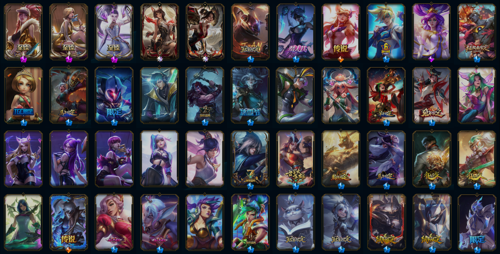 【传说皮肤】光明哨兵格雷福斯 女主播迦娜 墨之影武者易 冰霜之刃艾瑞莉娅 星之守护者金克丝 暗星塞拉斯 源计划超体莫德凯撒 偶像歌手阿狸 陆地王者4WD布里茨 战地巨兽科加斯 蔷薇绅士杰斯 星之守护者阿狸 黑夜使者索拉卡 西部天使赛娜 泳池派对吉格斯 约德尔国队长提莫 苍穹之光韦鲁斯 黯晶凤凰艾尼维亚 西部天使艾希 战场女武神凯尔 炼狱魔犬内瑟斯 星之守护者霞 西部魔影卢锡安 电玩女神娑娜 神龙尊者圣龙李青 合金巨兽努努和威朗普 宇航员诺提勒斯 鬼魂新娘莫甘娜 血石领主弗拉基米尔 天煞劫 源计划毁灭派克 神拳李青 焰尾妖狐阿狸 真实伤害艾克 驯龙学者黑默丁格 枯萎之壤泽拉斯 星之守护者洛 铁哥们儿奥拉夫 暗星尊烬 双重冰晶艾尼维亚 地狱之门卫士加里奥 律政大亨蒙多 魔幻卡牌崔斯特 奥德赛凯隐 冰川巨兽墨菲特 恶魔男爵瑞兹 黯黑魔龙希瓦娜 最终BOSS维迦 大天使长米迦勒凯尔 神王德莱厄斯 神王盖伦 绅士科加斯 红色男爵库奇 女皇艾希 星之守护者拉克丝 苹果机器人布里茨 屠龙勇士潘森 腥红之月鬼武姬阿卡丽 恶魔之刃泰达米尔 上古战魂魔腾 提莫约德尔人的一大步 霸天零式赛恩 钢铁军团盖伦 源计划林易 烈焰雄心崔丝塔娜 第三类接触黑默丁格 死亡骑士盖伦 银河魔装机神兰博 金牌主播德莱文 灌篮高手德莱厄斯 霸天异形卡兹克 黑夜使者亚索