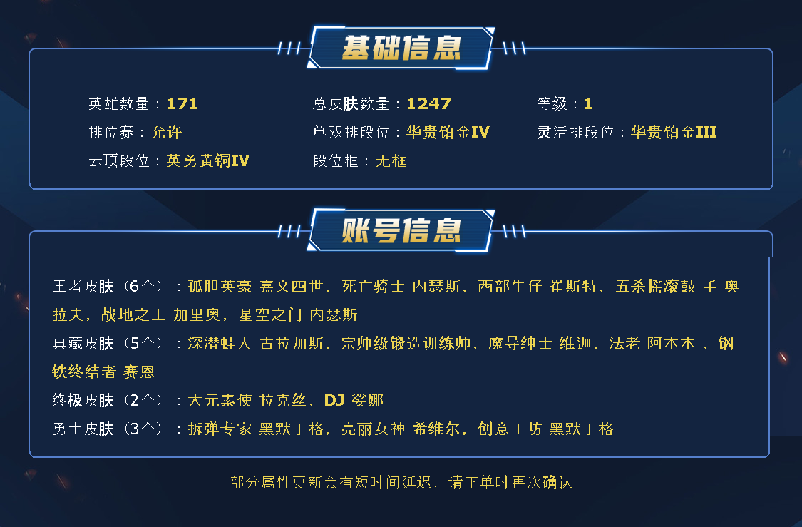 ~~喜欢记得收藏~~可排位~~1233皮全英雄~~租之前尽量查一下游戏ID,确保段位是您需要的,避免浪费您的时间~~请勿挂机逃跑故意送人头,谢谢合作,谢谢~~