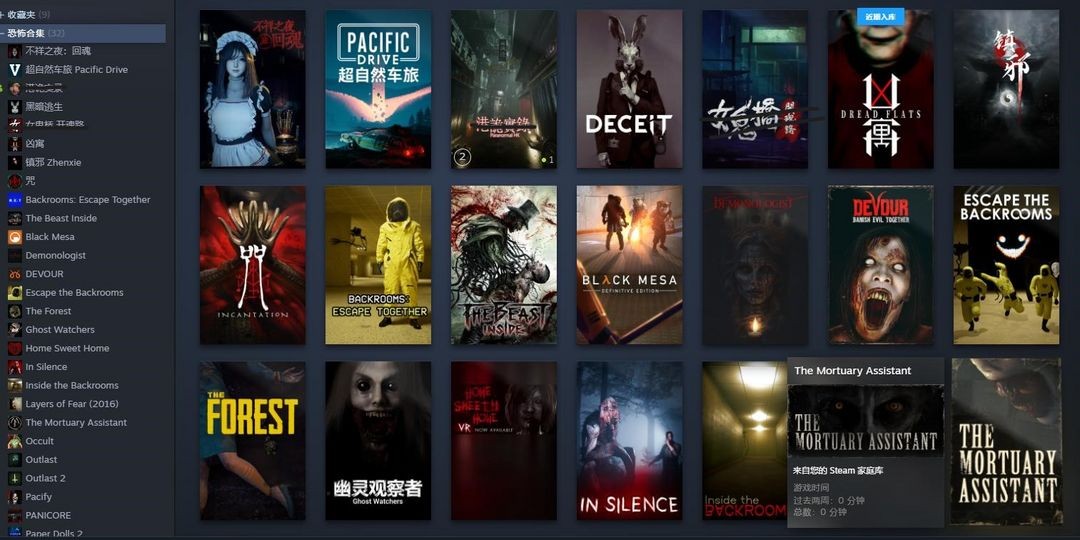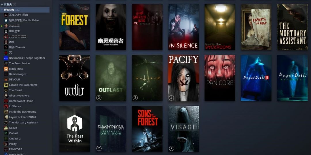 账号为恐怖联机游戏合集:恐鬼症、心魔、逃离后室、安抚、逃离后室一起、面容、层层恐惧、 森林、森林之子、不祥之夜回魂、甜蜜之家、逃生1+2、港-诡-实录、女鬼-桥1+2、纸人1+2、镇邪、咒、吞噬、恶魔学家、恐慌核心、超自然之旅、幽灵观察者、内心往事、黑山研究所、寂静、停尸间助手、Occult