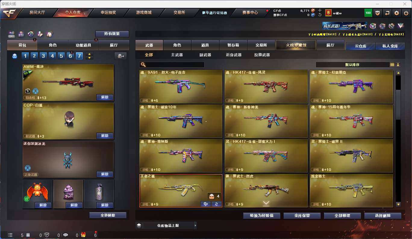 【m200-幻神】 【98k星神】 【传说光耀】 【传说暗裔】 【scar白虎】 【火麒麟+火麒麟-even】 【黑龙】 【雷神+雷神-宠儿+雷神-白鲨14冠军】 【黑骑士*6】 【毁灭+音效卡+荣耀之怒】 【裁决+异化之源】 【王者之心 王者之武】 【hk417-朱雀 玫瑰精灵】 【生化 6盘龙 炼狱 6烈龙 死亡之眼 毒蜂 异变清道夫】 【手呛 修罗】 【5近战 屠龙 龙啸 擎天*2 麒麟刺】 【四防 王者春 王者魅影】 【角色 炫 王者瞳闭月羞花 王者玲珑】