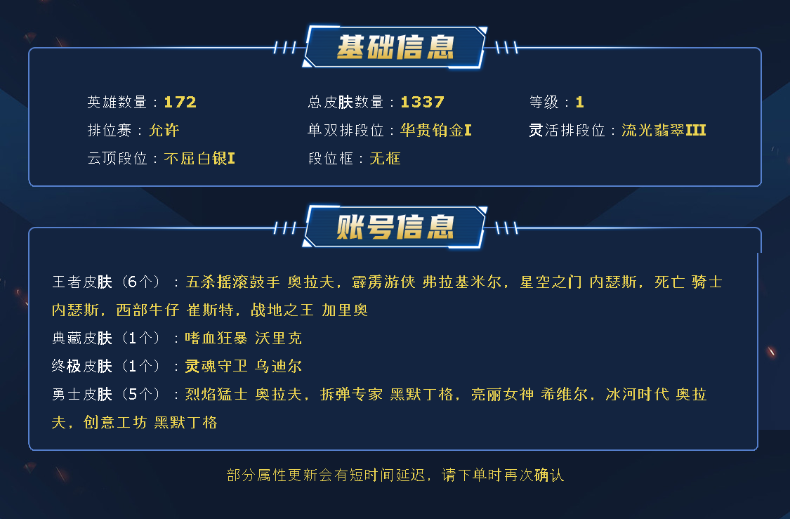 ~~喜欢记得收藏~~可排位~~1210皮全英雄丨856原皮354炫彩~~租之前尽量查一下游戏ID,确保段位是您需要的,避免浪费您的时间~~请勿挂机逃跑故意送人头,谢谢合作,谢谢~~