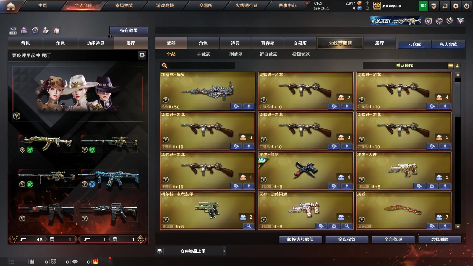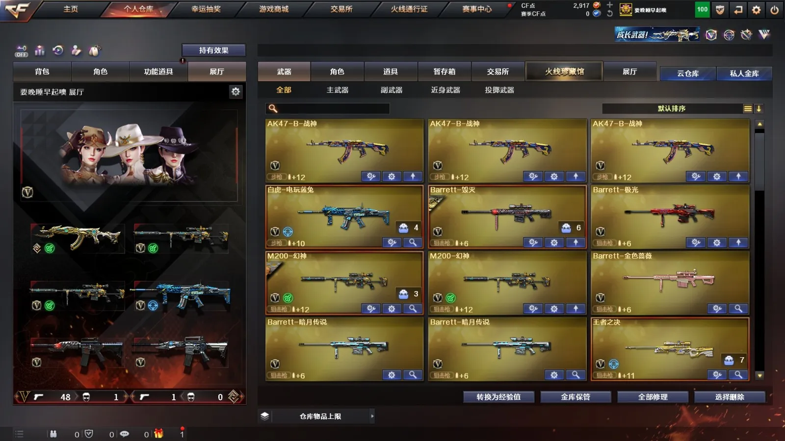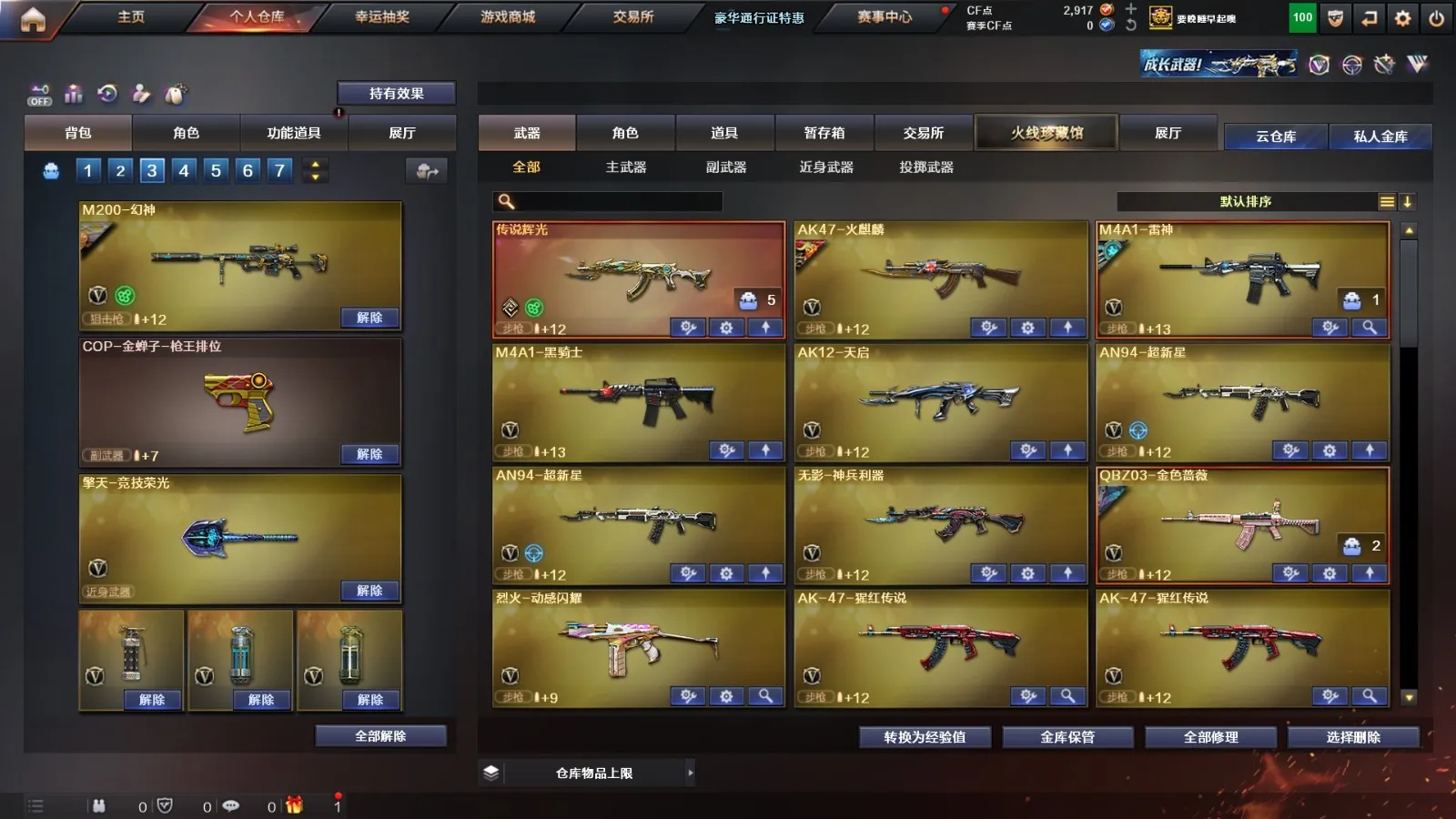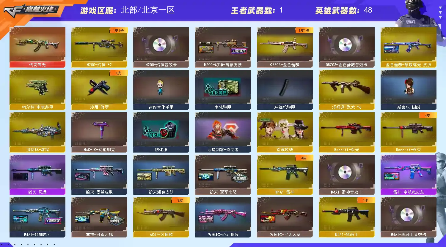 【主武】:传说辉光丨幻神+黄忠+音效丨王者之决丨白虎电玩丨毁灭(皮肤-耀金,风暴,冠军之怒,墨兰)丨6烈龙丨斯泰尔蝴蝶丨炼狱丨雷神(3皮肤+音效)丨QBZ金色蔷薇+皮肤+音效丨黑骑士+音效丨火麒麟+3皮肤丨火麒麟-绝迹丨AN94-超新星丨AK12天启丨无影-神兵利器丨烈火-动感闪耀丨AK47-猩红传说丨AK47-B-战神丨Barrett-极光丨Barrett-金色蔷薇丨Barrett-暗月传说丨AWM-裁决-百城联赛丨等各种活动武器