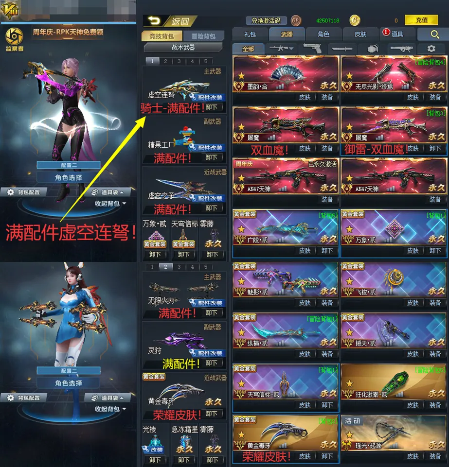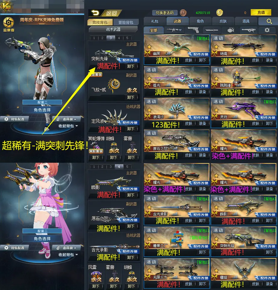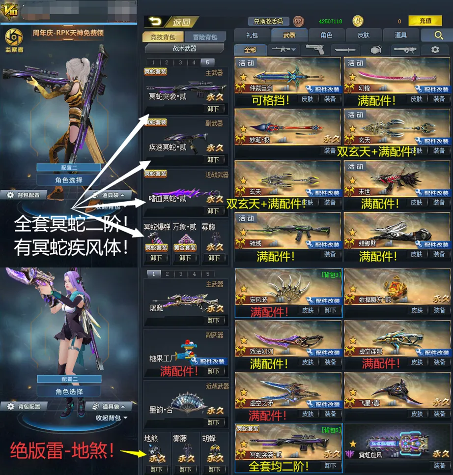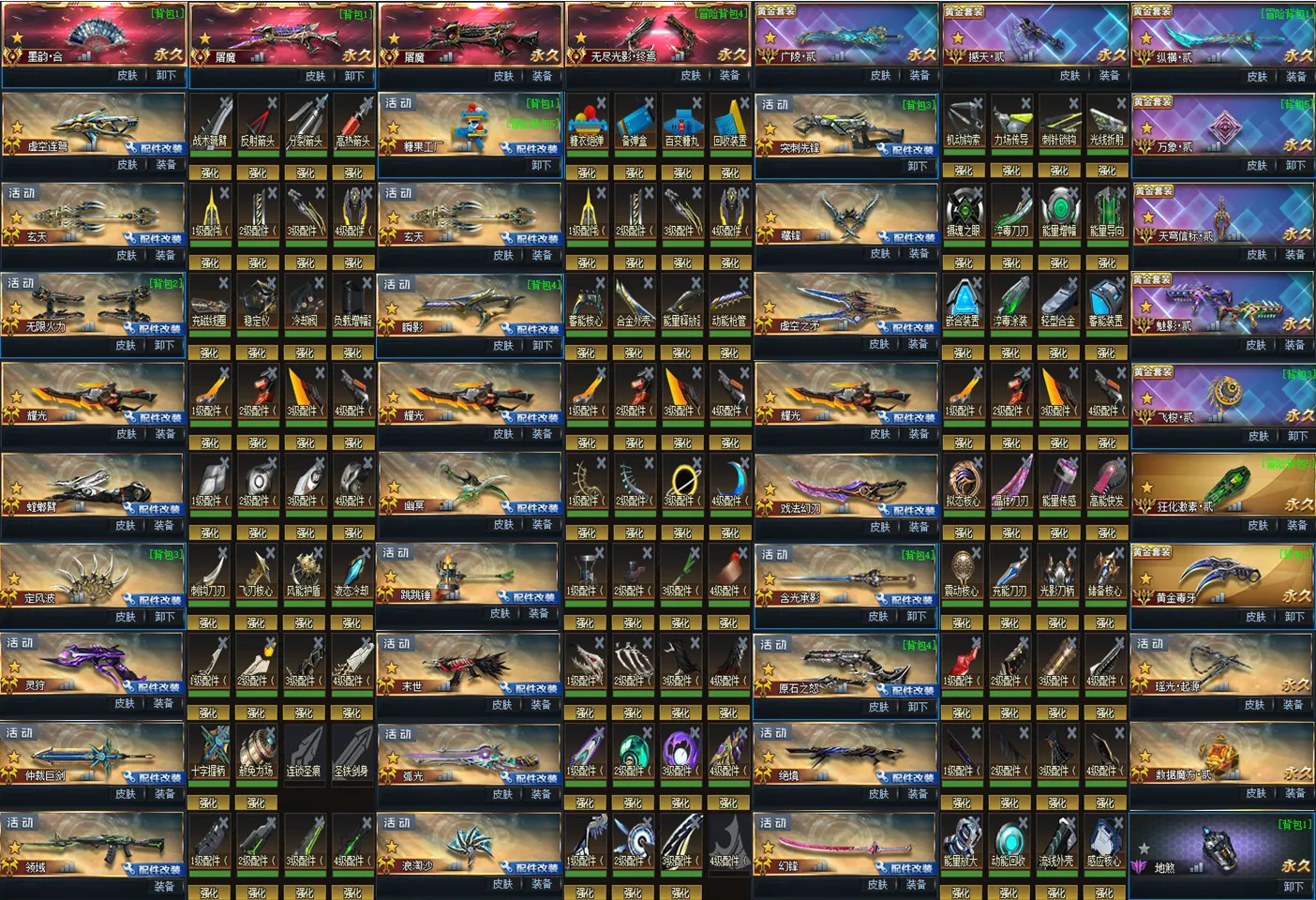 满配件武器:骑士•虚空连弩!糖果工厂!突刺先锋!双满玄天!藏锋!无限火力!瞬影!虚空之矛!三把染色+满耀光!螳螂臂!幽冥!戏法幻刃!定风波!跳跳锤!含光承影!灵狩!原石之怒!末世!格挡仲裁!弧光!绝境!领域!123浪淘沙!幻锋!