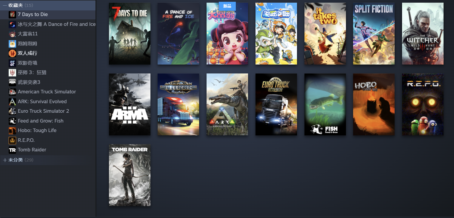 舒舒服服小岛时光、梦之形(Shape of Dreams)、PEAK、大富翁111、胡闹厨房2/分手厨房(Overcooked! 2)、泡姆泡姆、双影奇境、双人成行、REPO、森林之子(Sons Of The Forest)、迷失森林(The Forest)、沙石镇时光、小动物餐吧、超级鸡马、只只大冒险/只知大冒险、武装突袭3(Arma3)、古墓丽影9(Tomb Raider)、方舟生存计划(ARK: Survival Evolved)、巫师3狂猎豪华版(THE WITCHER 3: WILD HUNT GAME OF THE YEAR EDITION)、海底大猎杀(Feed and Grow: Fish)、美国卡车模拟、七日杀、冰与火之舞、欧卡2/欧洲模拟卡车2合集地图包波罗的海岸东欧北欧黑海合集全DLC/欧洲卡车模拟(Euro Truck Simulator 2)、你画我猜2(Drawful 2)