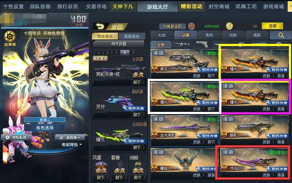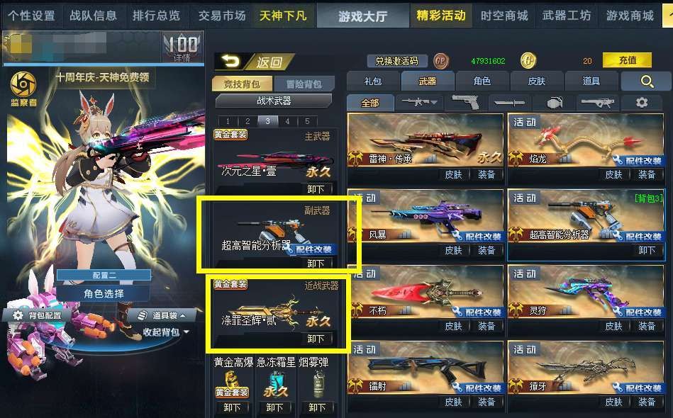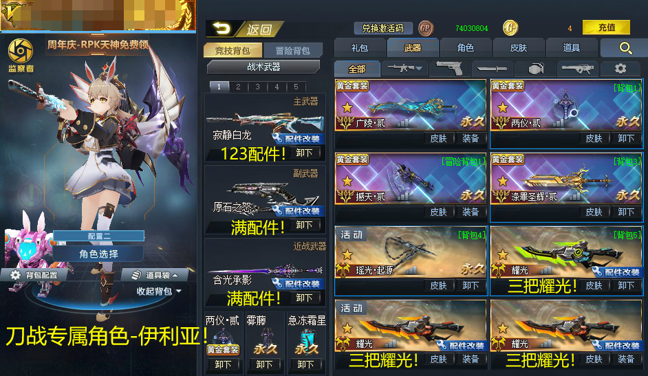 刀锋角色:伊莉亚!广陵贰!无踪(3配件)3把耀光(其中一把满配,其它也都是都有配件),幻锋可以连拔,仲裁巨剑相当于满配(4配件不影响刀战),撼天二,涤罪二,暗水晶,满配陷阵含光不朽魔方二,满配比伯原石之怒领域等等亦正亦邪武器,有次元之星壹,裁决,武圣,猎犬(有配件),瞬影(123配件),超高智能分析器(有4配件可复制敌人武器),赛bo野兽(有配件)等老武器