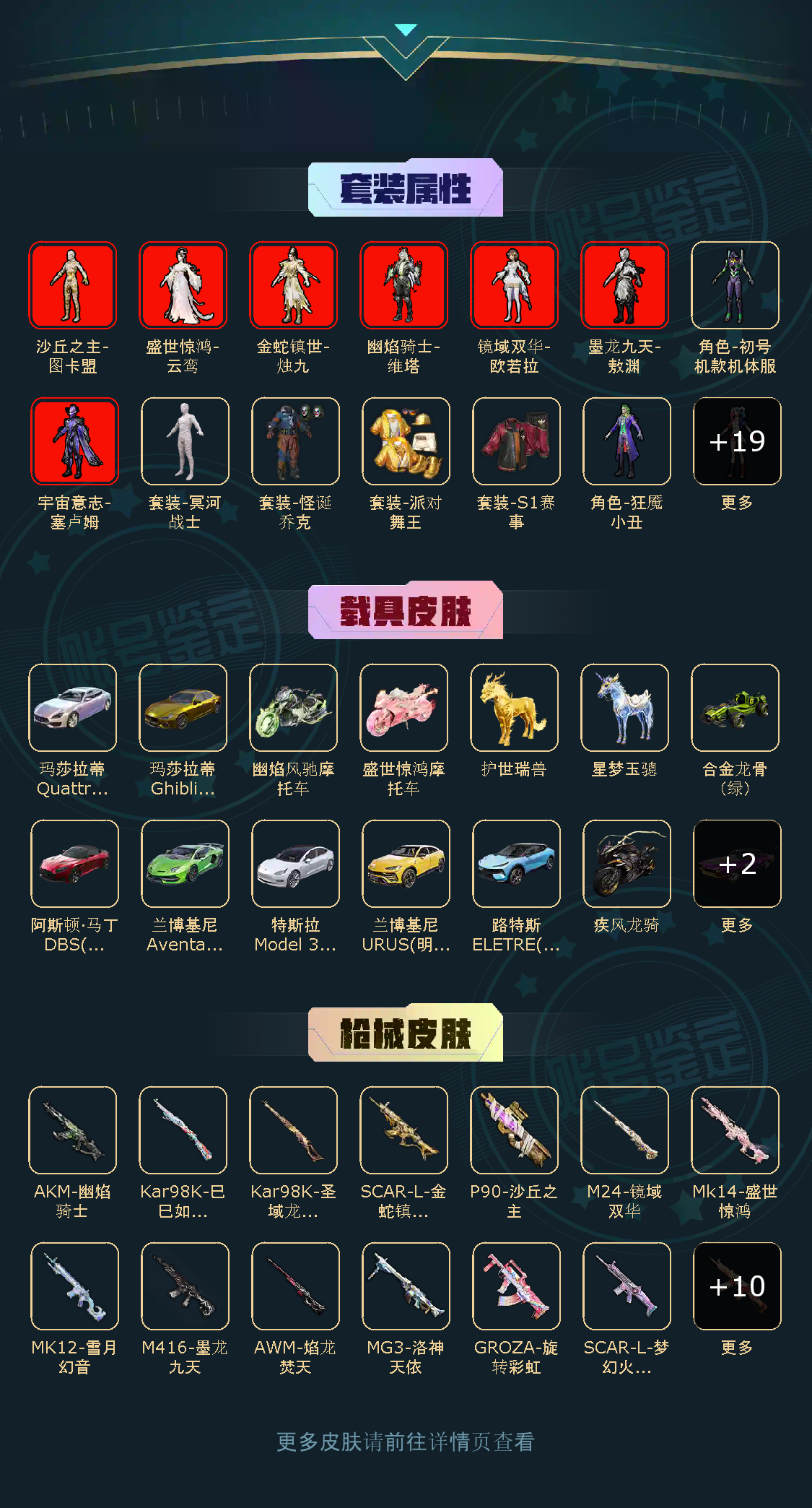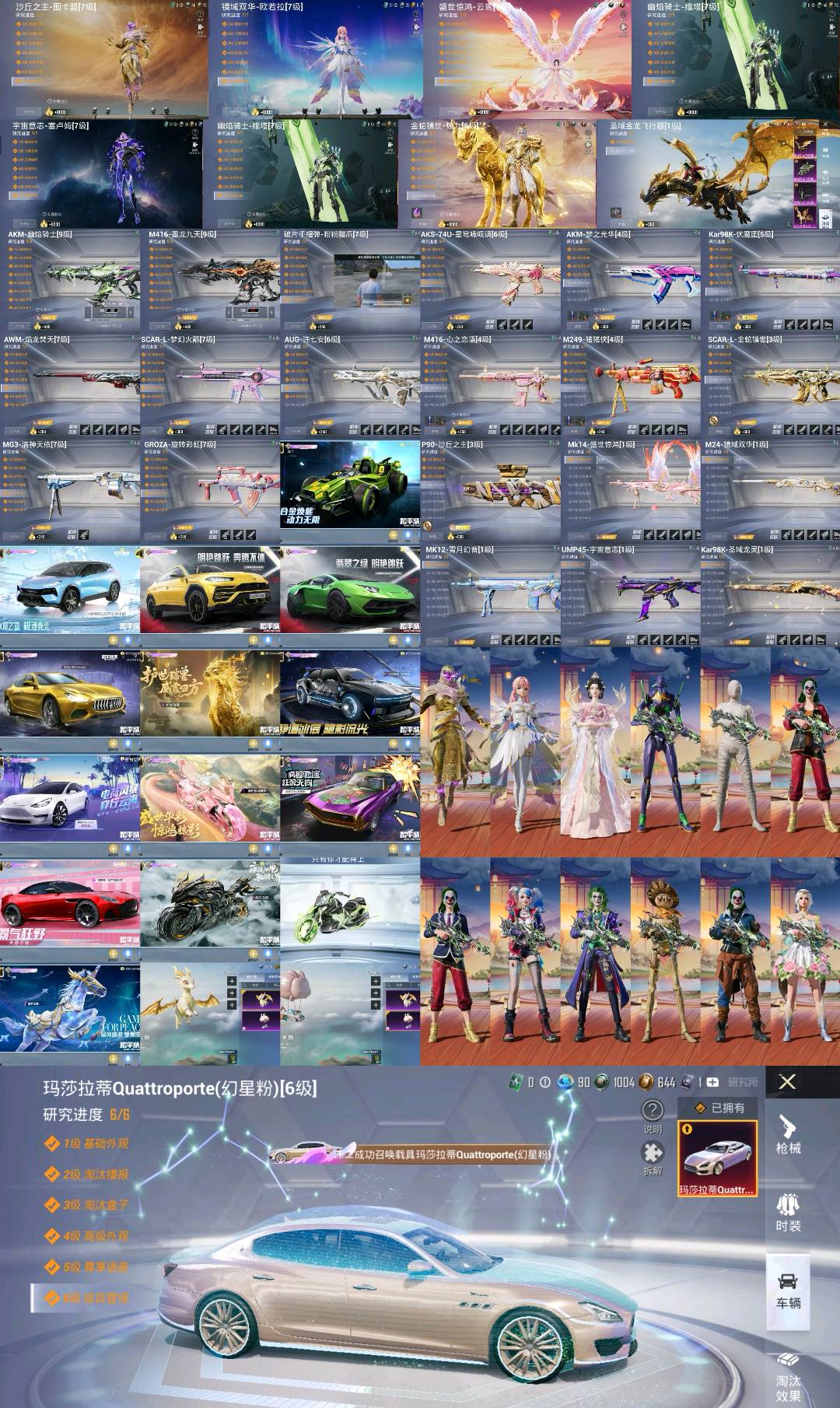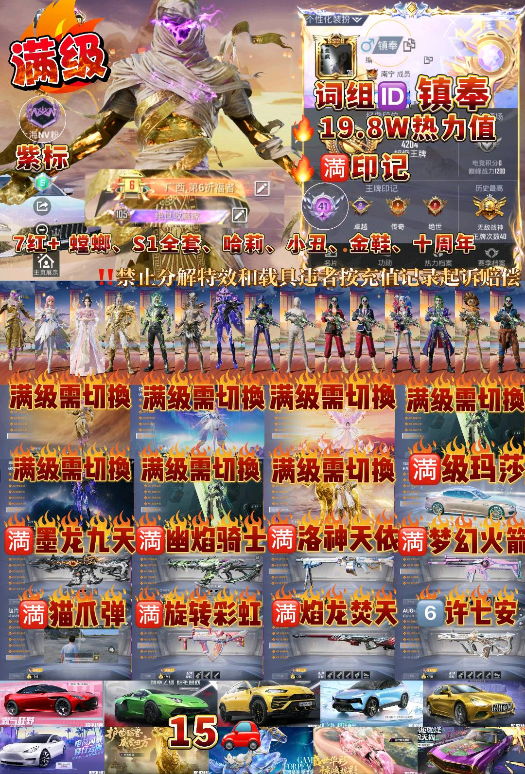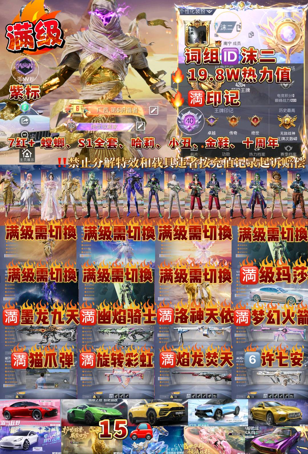 29粉,15载具,302套装,40王牌印记,无敌战神历史最高段,198667热力值 SCAR-L-梦幻火箭/GROZA-旋转彩虹/AKM-幽焰骑士/M416-心之恋语/M762-青锋波束/M416-墨龙九天/AUG-许七安/SCAR-L-金蛇镇世/AKM-梦之光华/Mk14-盛世惊鸿/MK12-雪月幻音/M249-猪猪侠/MG3-洛神天依/UMP45-量子极限/UMP45-宇宙意志/AKS-74U-星穹咏叹调/P90-沙丘之主/破片手榴弹-粉粉猫爪/Kar98K-伏魔团/Kar98K-圣域龙灵/AWM-焰龙焚天/Kar98K-巳巳如意/M24-镜域双华/玛莎拉蒂Ghibli(金)/特斯拉Model 3(珍珠白)/阿斯顿·马丁DBS(红)/玛莎拉蒂Quattroporte(幻星粉)/虚妄之影(炫耀紫)/路特斯ELETRE(冰川蓝)/兰博基尼URUS(明艳黄)/合金龙骨(绿)/兰博基尼Aventador(翡翠绿)/冰辰御座(神秘蓝)/护世瑞兽/星梦玉骢/疾风龙骑/幽焰风驰摩托车/盛世惊鸿摩托车/