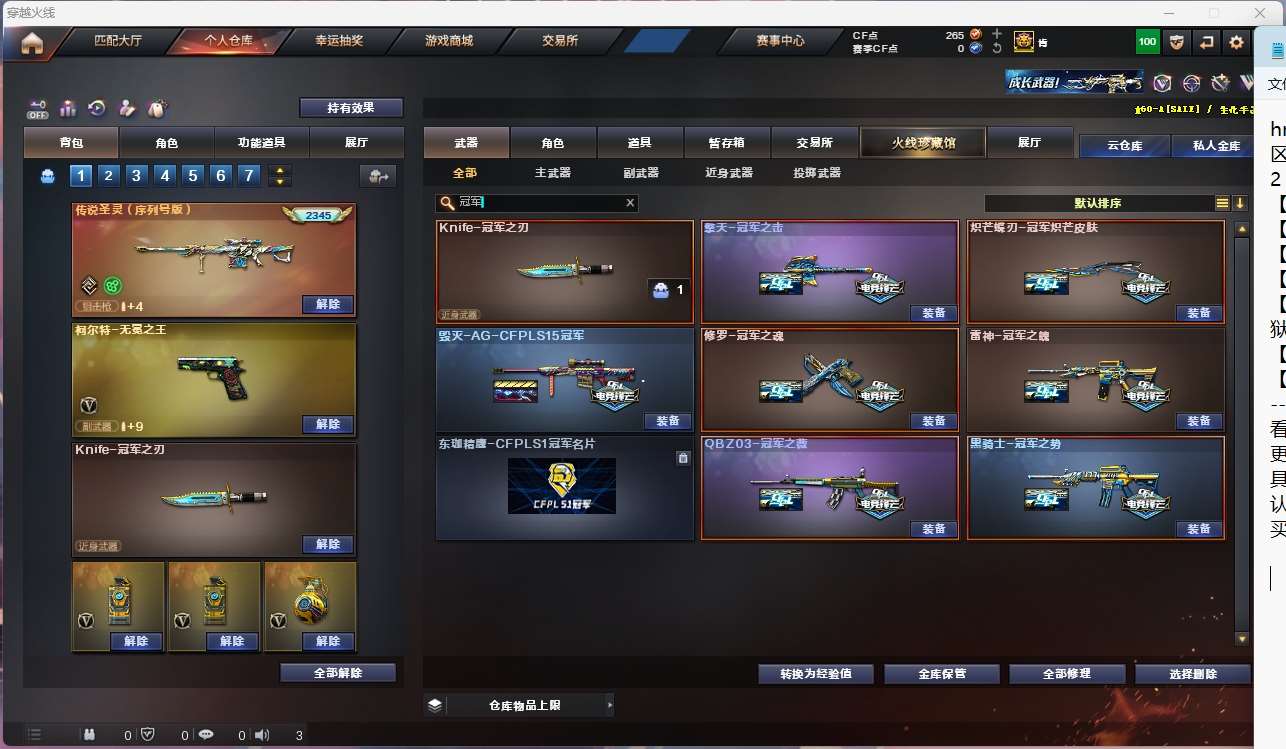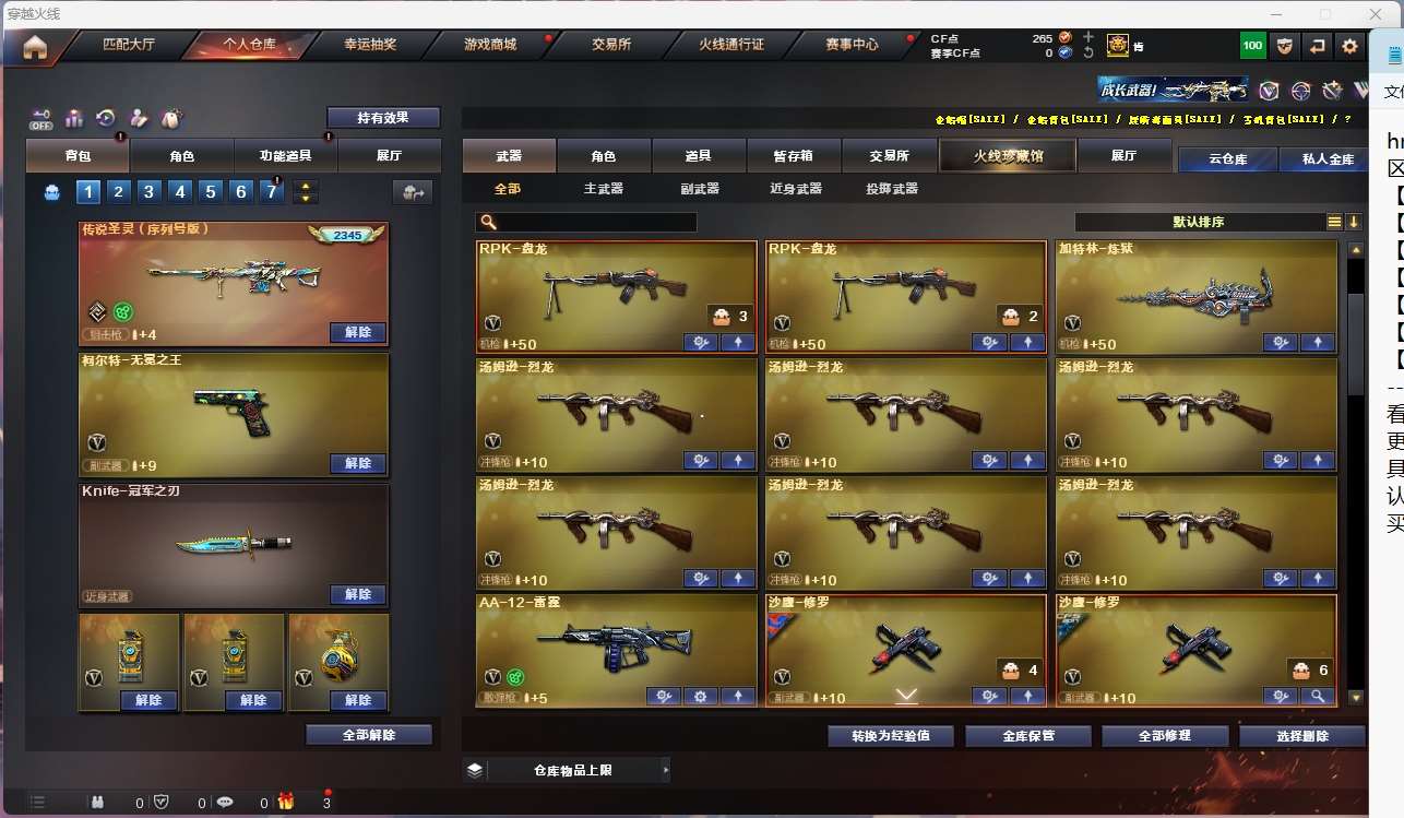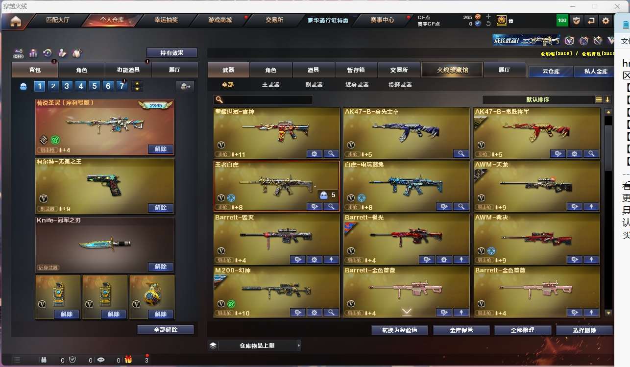 【亮点解析 传说角色 幻神3皮带卡 生化满配 3传说武器 哔哩哔哩名片】【四防传说艾莉莎 】【m200幻神+音效卡+丹凤+星火小队+cfs2022+冠军之刃】【王者星神】【6盘龙 炼狱 6烈龙 炽芒蝶刃*2+冠军炽芒 斯太尔蝴蝶 炼狱小刚 清道夫】【传说辉光 传说破晓】【传说圣灵(2345)】【王者白虎】【qbz金色蔷薇+卡+冠军之薇】【qbz天罚 】【hk417朱雀】【火麒麟+卡】【雷神+卡+宠儿+冠军之魄 】【黑骑士+卡+冠军之势】【毁灭+卡+cfs2018+ag15冠军+bean】【极光】【裁决】 【武器:武圣 青龙 王者之魄 王者冰魄 白虎电玩蓝兔 王者凤鸣 】 【12手呛:修罗*6 武圣 竞技荣光 天神 无冕之王 荣耀世冠柯尔特 雷霆王者】 【18刀具:屠龙*3 龙啸 擎天 麒麟刺 尼泊尔雷霆 斩神刀雷暴 神工天巧 王者之锋 王者之击 荣耀世冠龙啸 雷霆王者之锋 】 【6雷套:雷霆雷 雷暴雷*2 堕天神雷*2 竞技荣光雷】 【小人呛:火麒麟灵狐 天龙曼陀罗 炼狱小刚 】 【音效卡:雷神音效卡 火麒麟音效卡 黑骑士音效卡 毁灭音效卡 金色蔷薇音效卡 幻神动感闪耀音效卡 幻神音效卡 】 【四防角色:王者春 王者零国色天香 】